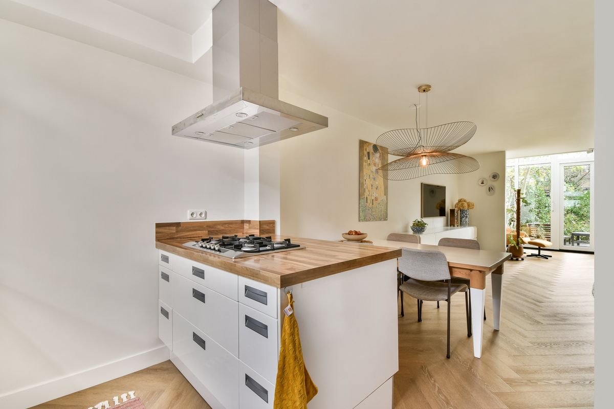 De woonkamer is een oase van licht dankzij de hoge serre die doorloopt tot de eerste verdieping – een architectonisch detail dat zorgt voor extra ruimtebeleving en verbinding met buiten. De open keuken is praktisch ingedeeld en voorzien van moderne apparatuur, ideaal voor gezellige avonden koken en tafelen.
