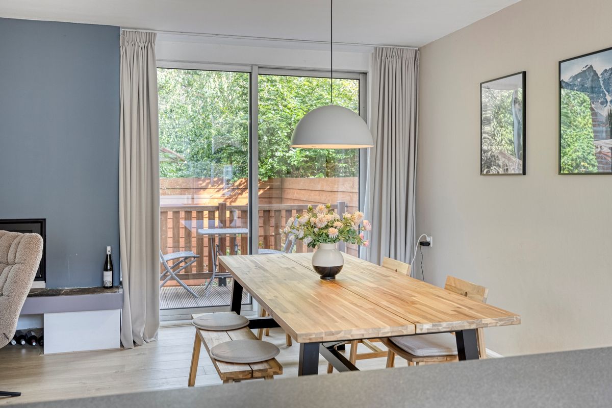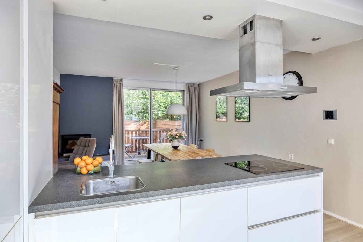 Vervolgens betreedt u de lichte woonkamer, die dankzij de ramen rondom en de open indeling een zeer prettige leefruimte vormt. Hier is genoeg ruimte om een comfortabele zithoek in te richten en gasten te ontvangen. De sfeervolle haard is de eyecatcher van de ruimte, terwijl de tuindeur directe verbinding biedt met de zonnige achtertuin.