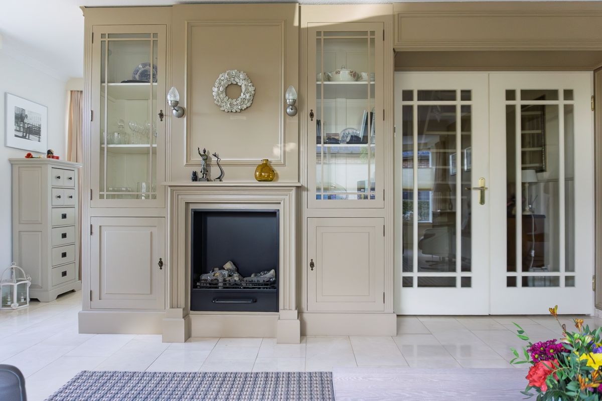 Vanuit de hal wordt via dubbele, beglaasde deuren de woonkamer betreden. De L-vormige woonkamer is royaal te noemen en in een voorkamer en achterkamer ingedeeld. In de voorkamer is aan de zijkant een erker aanwezig en aan de andere zijde een gelhaard met schouw ingebouwd in een vaste kast. Ook geeft de voorkamer toegang tot een naast de woonkamer gelegen studeer-/werkkamer. Door de vele raampartijen is er veel lichtinval in de voorkamer. De achterkamer is ruim te noemen met een zithoek voor de schuifpui waardoor de verbinding met de prachtige achtertuin kan worden gemaakt. Aan de andere kant van de achterkamer kan een grote eethoek worden geplaatst tegenover de sfeervolle gashaard. Hier is de deur aanwezig die toegang geeft tot de keuken. De afwerking van de woonkamer bestaat uit gedeeltelijk met hout en met spuitwerk afgewerkte wanden, een gespoten plafond en een marmervloer.