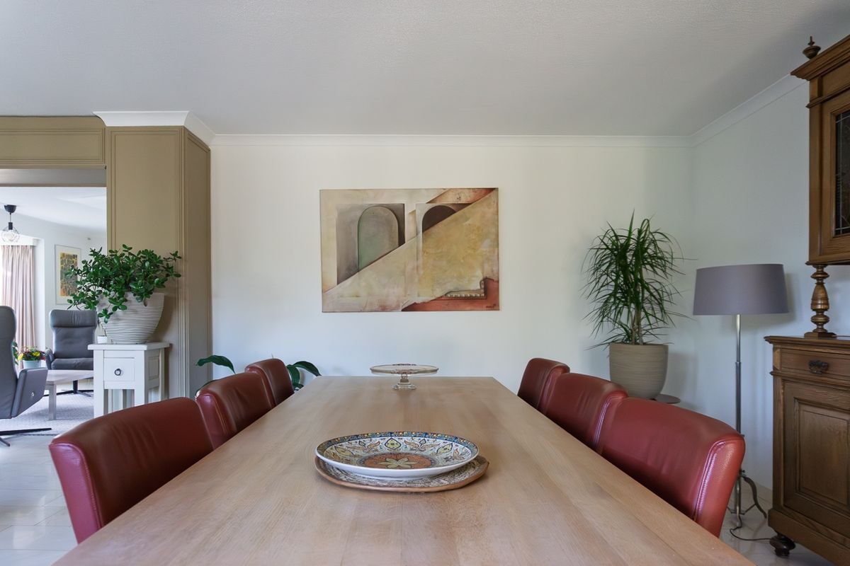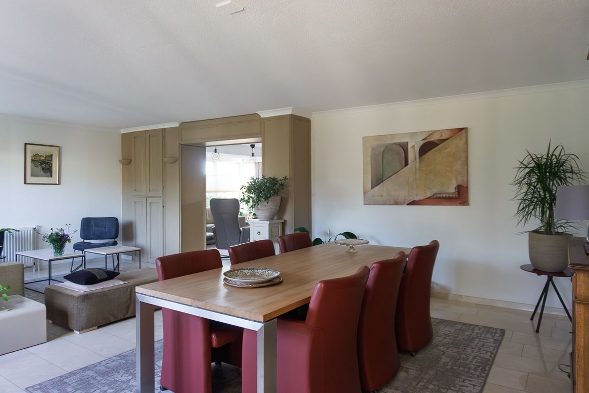 De woning beschikt op de begane grond over een ruime hal die met een dubbele deur toegang geeft tot de royale woonkamer van zo'n 70 m2 met hiernaast een werk-/studeerkamer. Aan de achterzijde is de woning uitgebouwd. Hierin bevindt zich de keuken die toegang geeft tot de garage. De garage is ook toegankelijk vanuit de hal van de woning. Op de 1e verdieping bevinden zich 3 slaapkamers, een kastenkamer en de badkamer met ligbad, douche, toilet en dubbele wastafel. Op de overloop van de 1e verdieping is in het plafond een luik aanwezig wat met een vlizotrap toegang geeft tot een grote bergzolder. Achter, voor en aan de zijkant van de woning ligt de prachtig aangelegde en onderhouden tuin met veranda, vijverpartij en mooie plantenborders en bomen; een plaatje! Voor de woning ligt een oprit waar 2 auto's op eigen terrein kunnen worden geparkeerd. De woning is volledig geïsoleerd en zorgt voor een deel voor de eigen energievoorziening door de aanwezigheid van 9 zonnepanelen en beschikt over energielabel B.