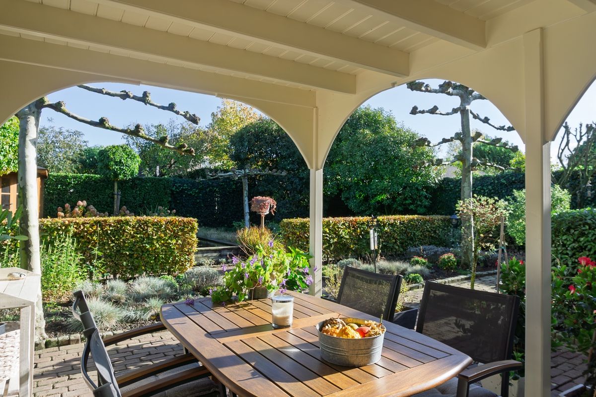 De tuin bij deze woning is een plaatje. De achtertuin is op het noordoosten gesitueerd waardoor er altijd een plaatsje is te vinden in de zon of in de schaduw. Voor de keuken staat een veranda waardoor het ook met minder weer hier fijn zitten is. De achtertuin is aangelegd in ‘kamers’ met klinkerbestrating, plantenborders, hagen, bomen en een verhoogde vijverpartij. Achter in de tuin staat een houten tuinberging voor onder andere de tuinspullen. De tuin is volledig omheind en grotendeels begroeid met hedera. In de omheining zit richting de zij-/voortuin een poort. De voortuin is aangelegd met hagen, platanen en bestrating. Voor de garage ligt de oprit waar 2 auto’s kunnen worden geparkeerd.