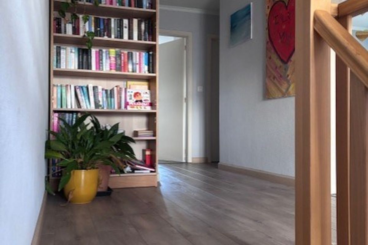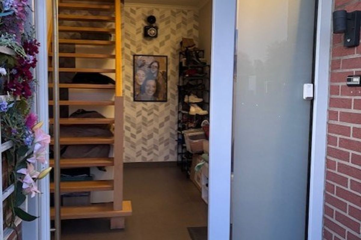 Je betreedt de woning via de voortuin of via de oprit en achteringang. In de hal vind je praktische opbergkasten en de trap naar de verdieping.