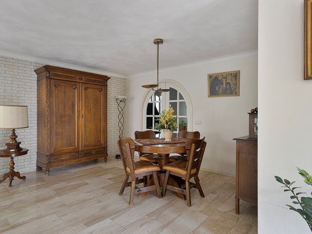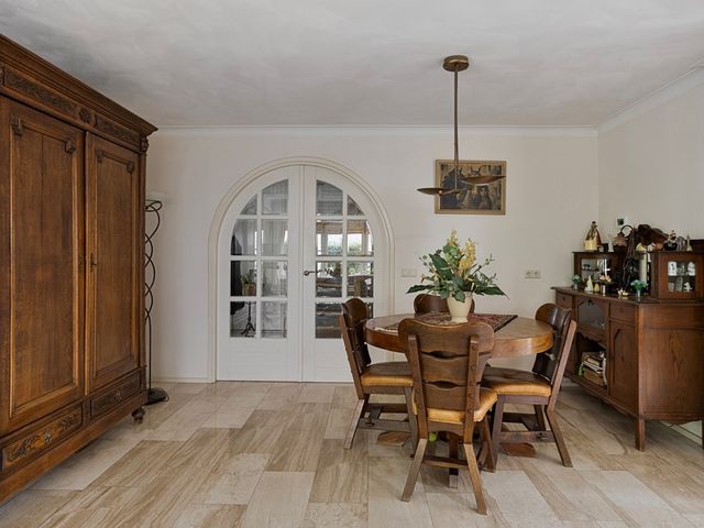 De comfortabele, gezellige living (circa 62 m²) met diverse zithoeken is voorzien van dubbele ronde deuren met roedenverdeling. De vloeren zijn voorzien van vloerverwarming.