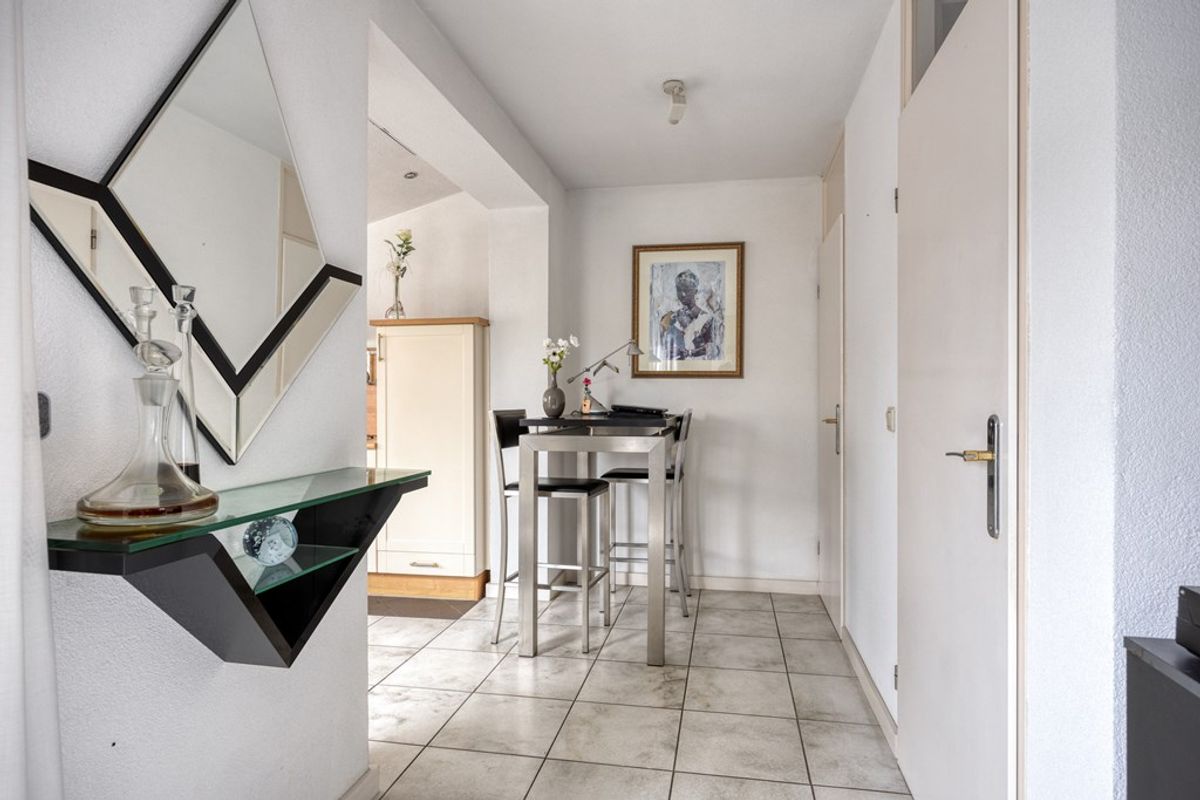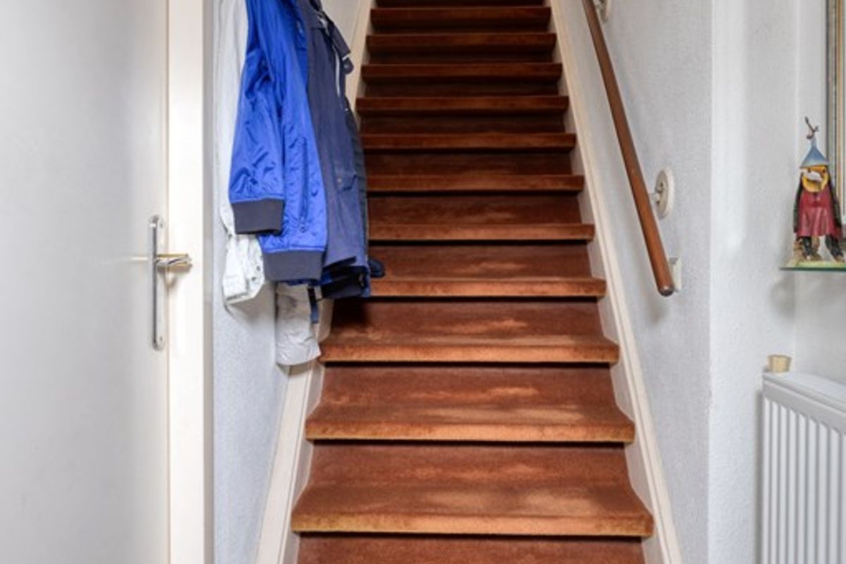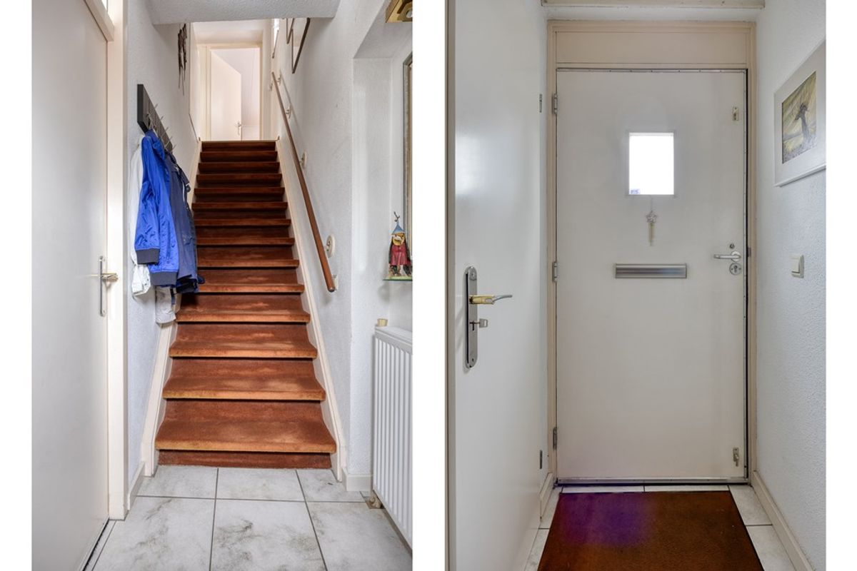 Hal met tegelvloer en meterkast en trap naar de eerste verdieping.