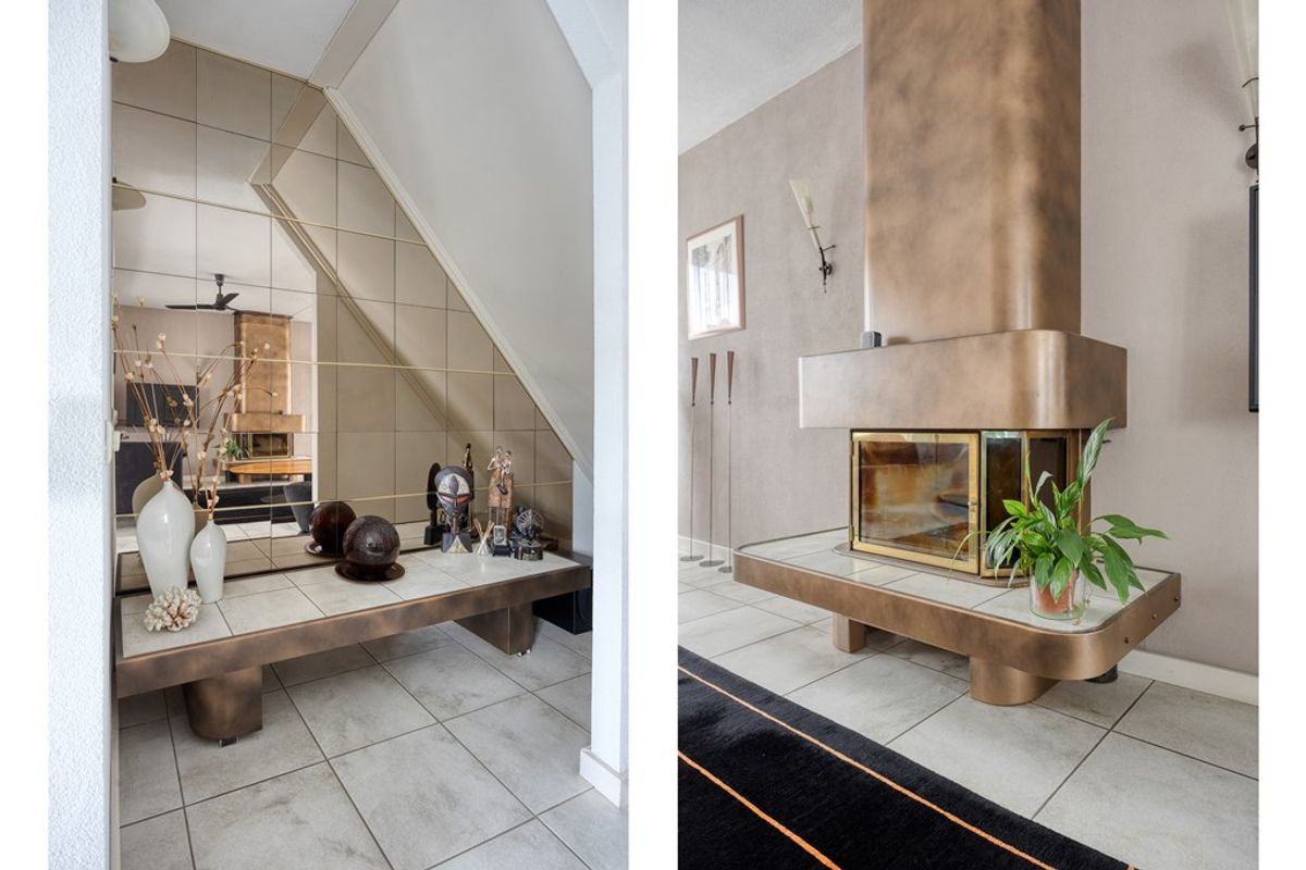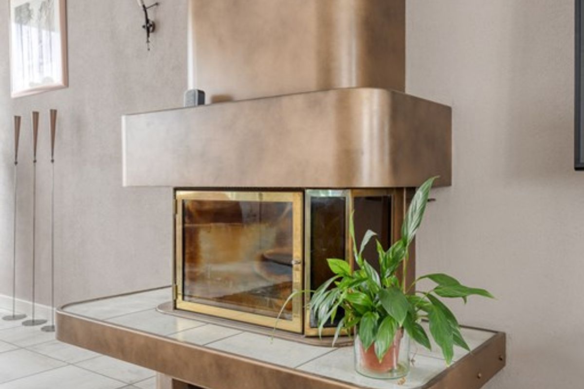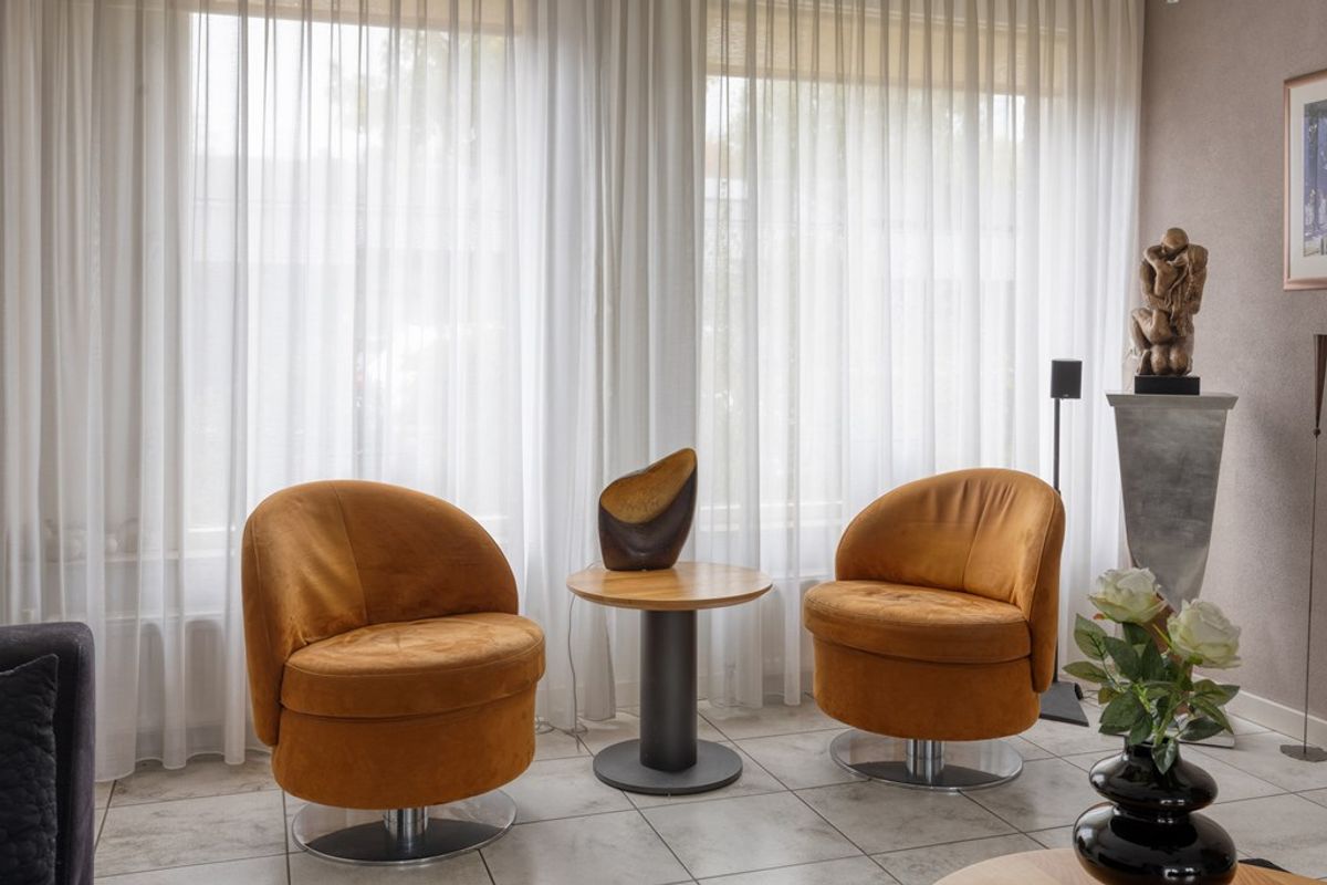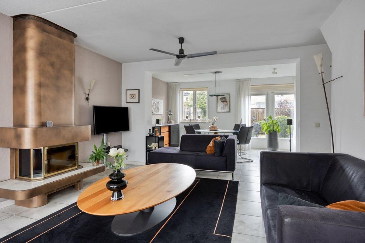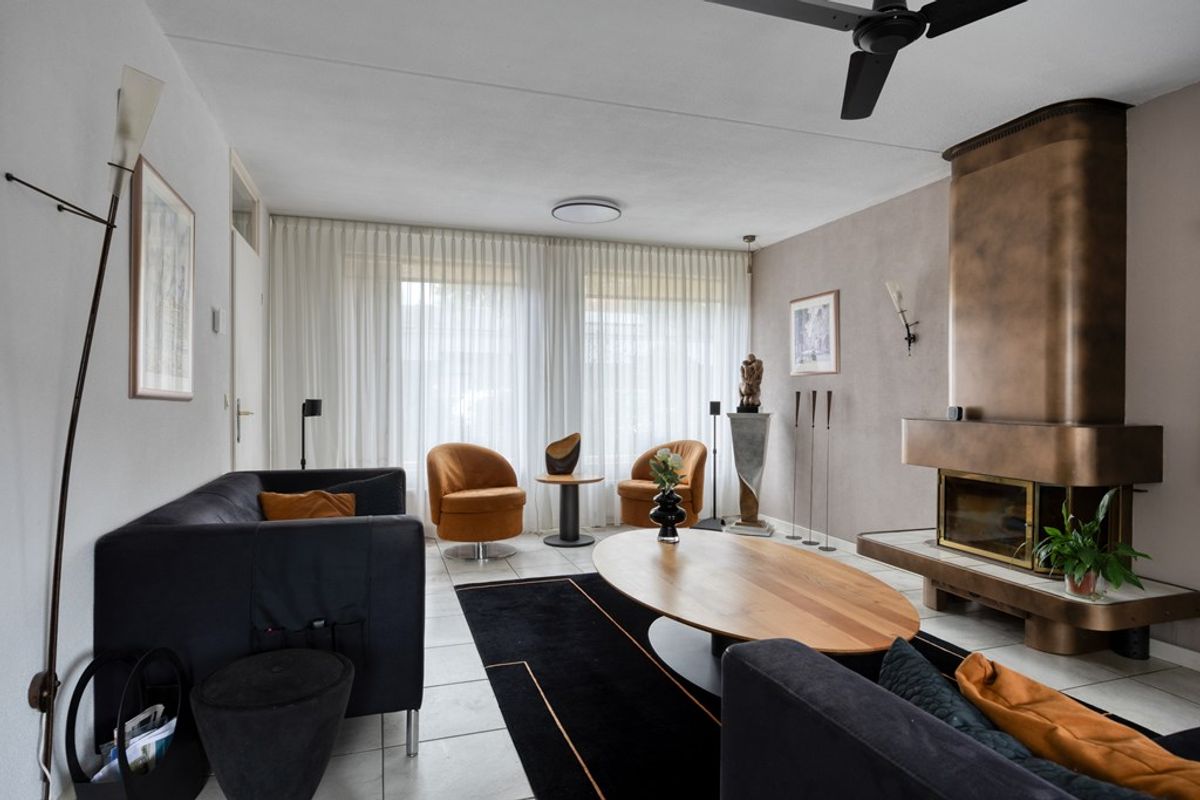 Royale woonkamer geheel voorzien van een tegelvloer met vloerverwarming. De sfeervolle haard maakt de woonkamer compleet.