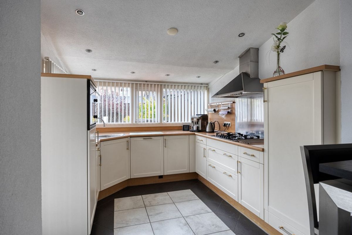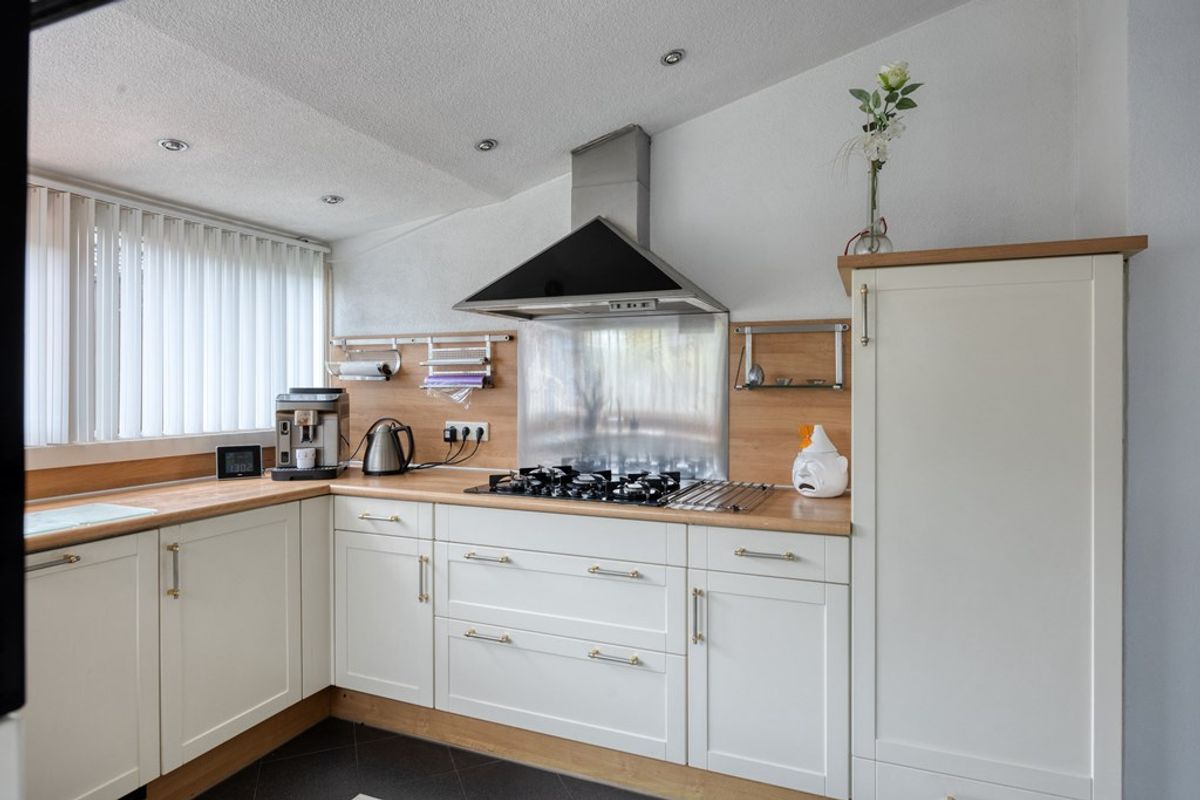 Ruime aanbouw alwaar zich een complete keukeninstallatie bevindt incl. alle apparatuur te weten, vaatwasser, gaskookplaat afzuigkap inbouwkoelkast en combimagnetron. Via de aanbouw middels een deur tevens toegang tot de tuin.