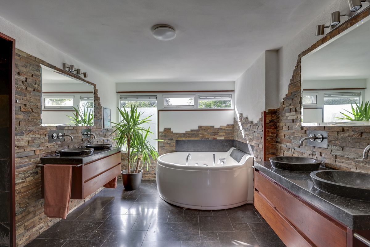 Op de eerste verdieping bevinden zich vier slaapkamers, waarvan drie met vaste kasten en één met toegang tot het balkon, en een separate toiletruimte met wandcloset, urinoir en fonteintje. De ruime badkamer is een ware wellnessruimte, rijkelijk afgewerkt met hoogwaardig natuursteen en voorzien van een inloopdouche, whirlpool en dubbele wastafelmeubels – een plek waar comfort en luxe samenkomen.