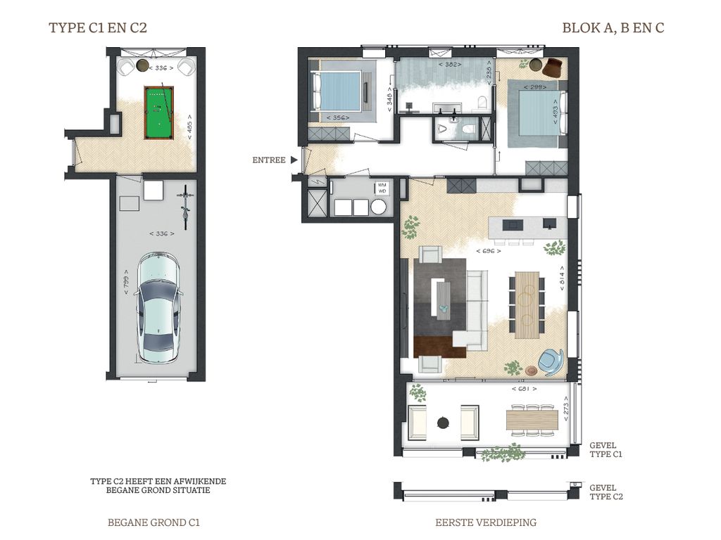 De Type C-appartementen zijn driekamer-plus woningen: naast twee slaapkamers beschikt u op de begane grond over een extra ruimte, ideaal voor een hobby, werkplek of atelier. De ligging bepaalt uw voorkeur: zo geniet u bij een hoekappartement van extra privacy en optimale lichtinval.