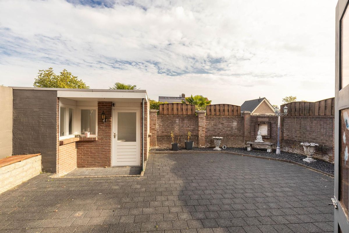 Grotendeels beklinkerde achtertuin en tuinberging. De achtertuin is ook voorzien van een achterom voor gemakkelijke toegang.