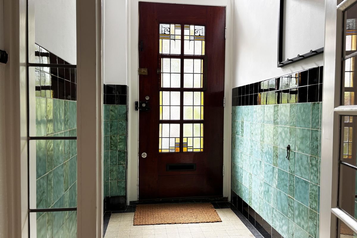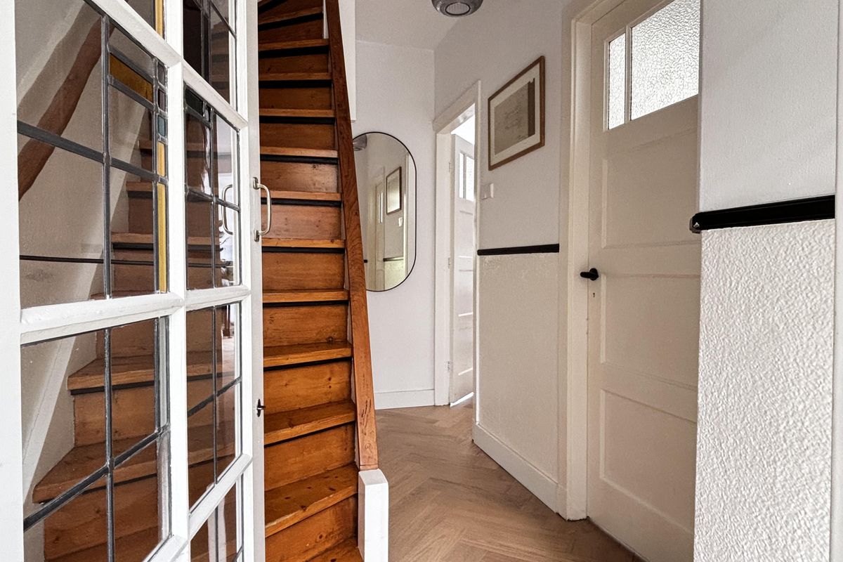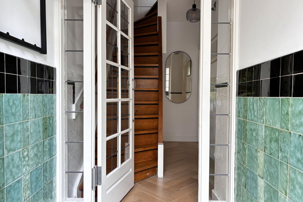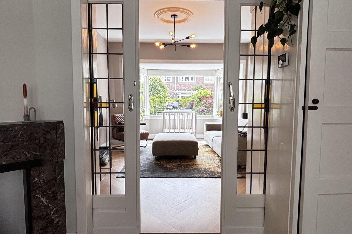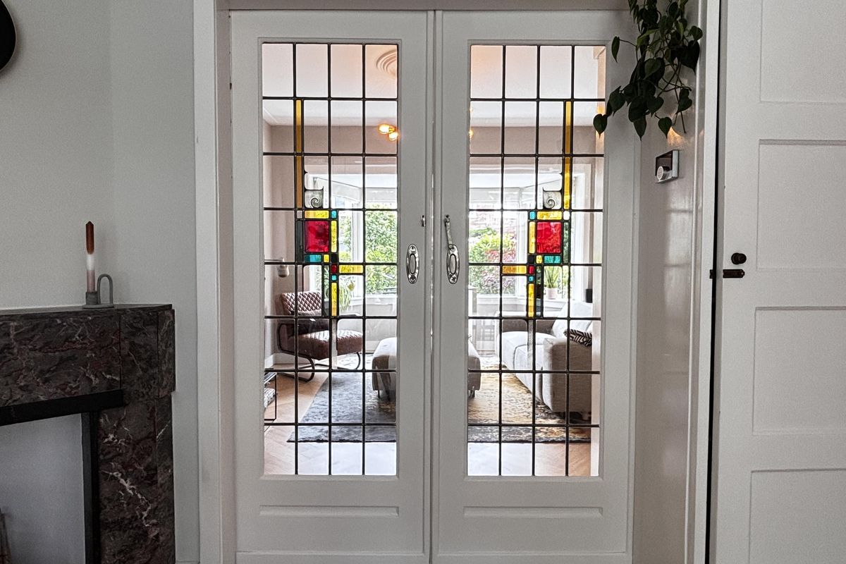 The cozy sitting room with bay window has typical 1930s details, such as en-suite doors with stain glass that provide access to the very spacious dining room/open kitchen. The modern kitchen is equipped with all necessary built-in appliances and the cooking island is also an ideal breakfast or drinks spot. The well-kept backyard - located on the West - is accessible through the double doors. There is a practical storage room in the garden. This is easily accessible by bicycle via the back entrance.
