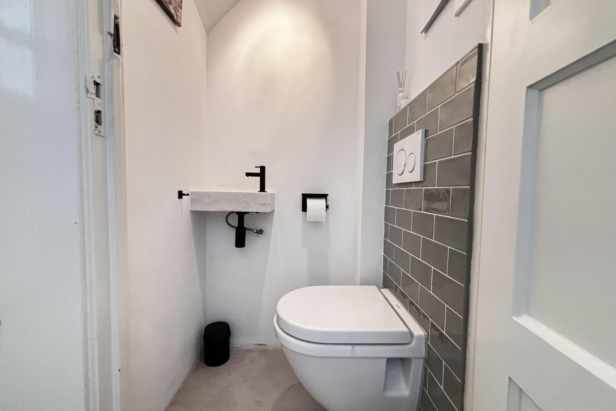 Hal, modern toilet met fontijntje, trap naar de bovenverdieping en toegang tot zowel de zitkamer als eetkamer/keuken.