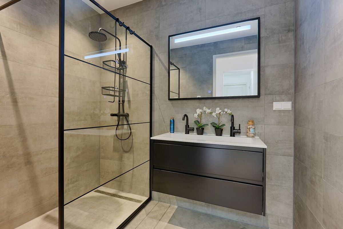 Entree woning naar hal met toegang tot de lichte woonkamer met luxe open keuken, voorzien van een Samsung Amerikaanse koelkast met ijsdispenser, vaatwasser, oven, magnetron, inductiekookplaat en afzuigkap. Vanuit de woonkamer zijn er openslaande deuren naar de ruimte tuin op het westen, ideaal om van de middag- en avondzon te genieten. Er zijn 2 ruime slaapkamers. De moderne badkamer heeft een inloopdouche, verlichte spiegel, dubbele wastafel en inbouwspots. Tevens is er een technische ruimte met mechanische ventilatie, warmwaterboiler, en de aansluiting voor wasmachine en droger.