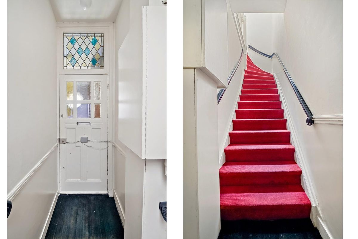 Open porch leading to the first floor. Entrance to the apartment with meter cupboard and internal staircase to the second (top) floor. Landing with skylight, separate toilet, and built-in cupboards housing the central heating boiler.