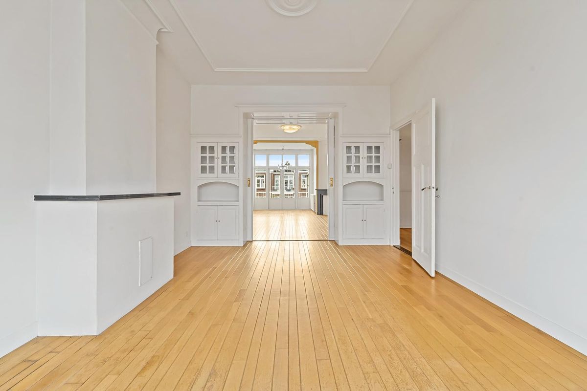 Ruime centrale gang met toegang tot de woon-/eetkamer ensuite, voorzien van schuifseparatie met vaste kasten, een sfeervolle erker en schouwen. Via openslaande deuren toegang tot het eerste balkon.