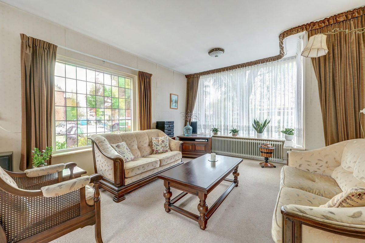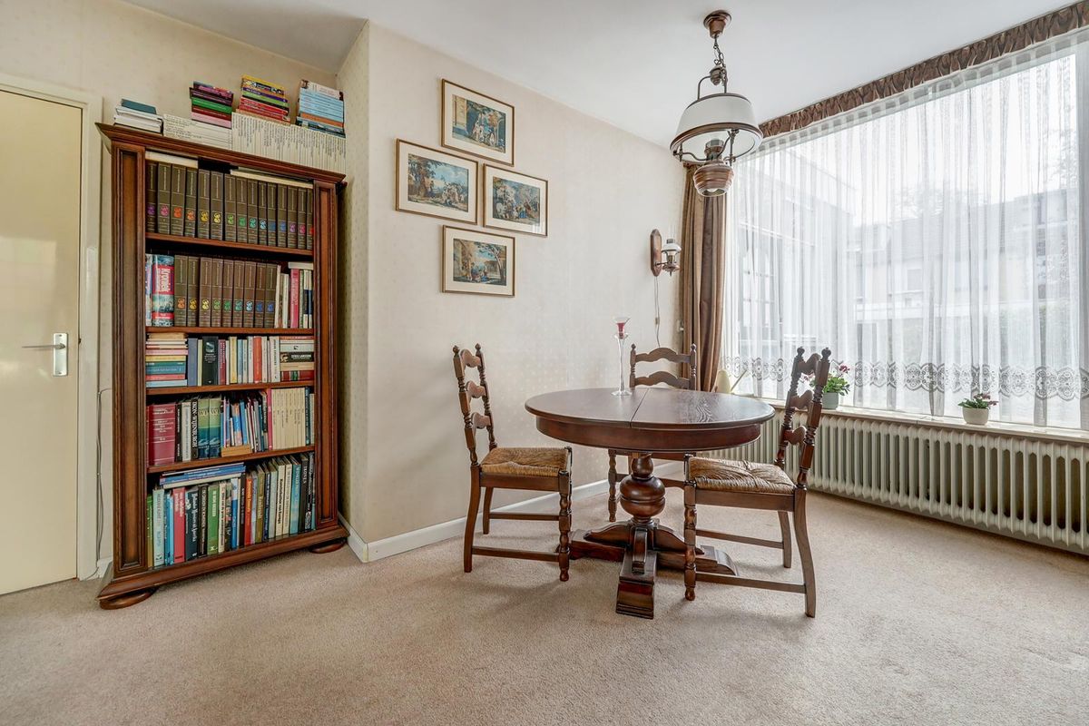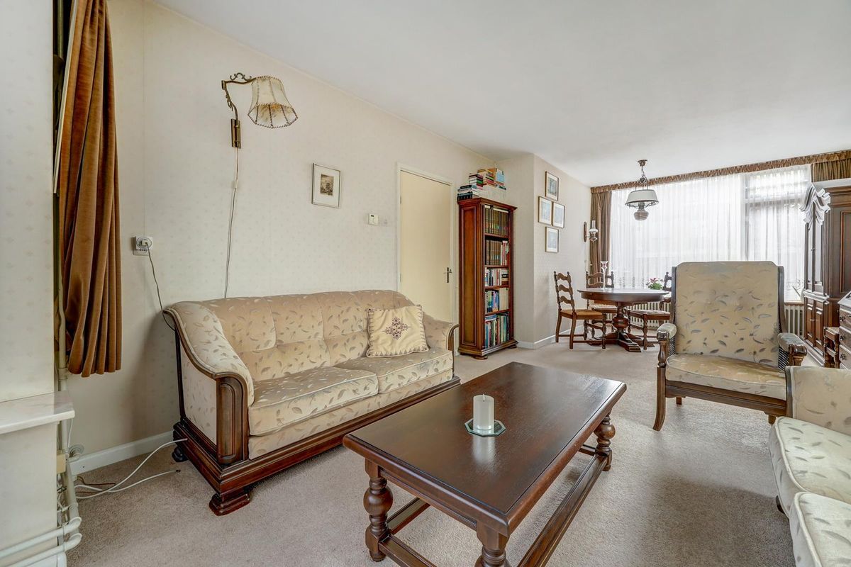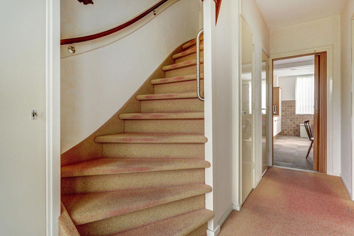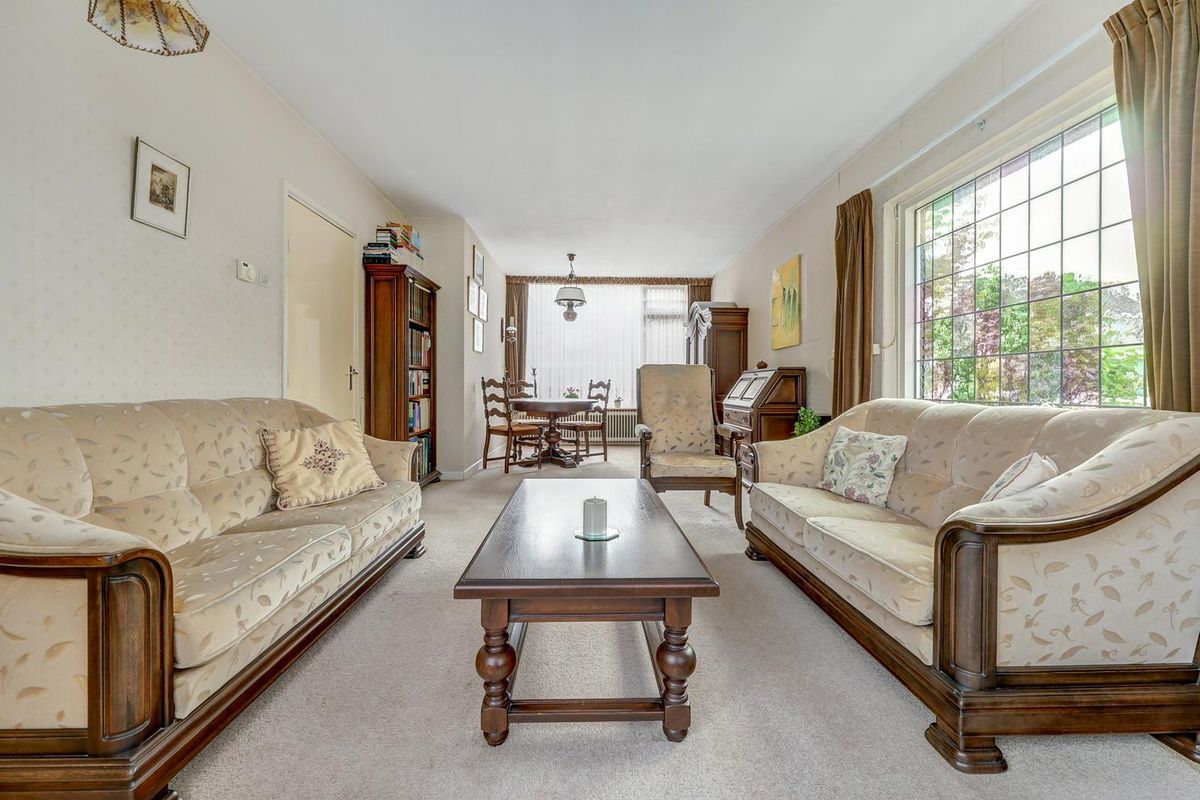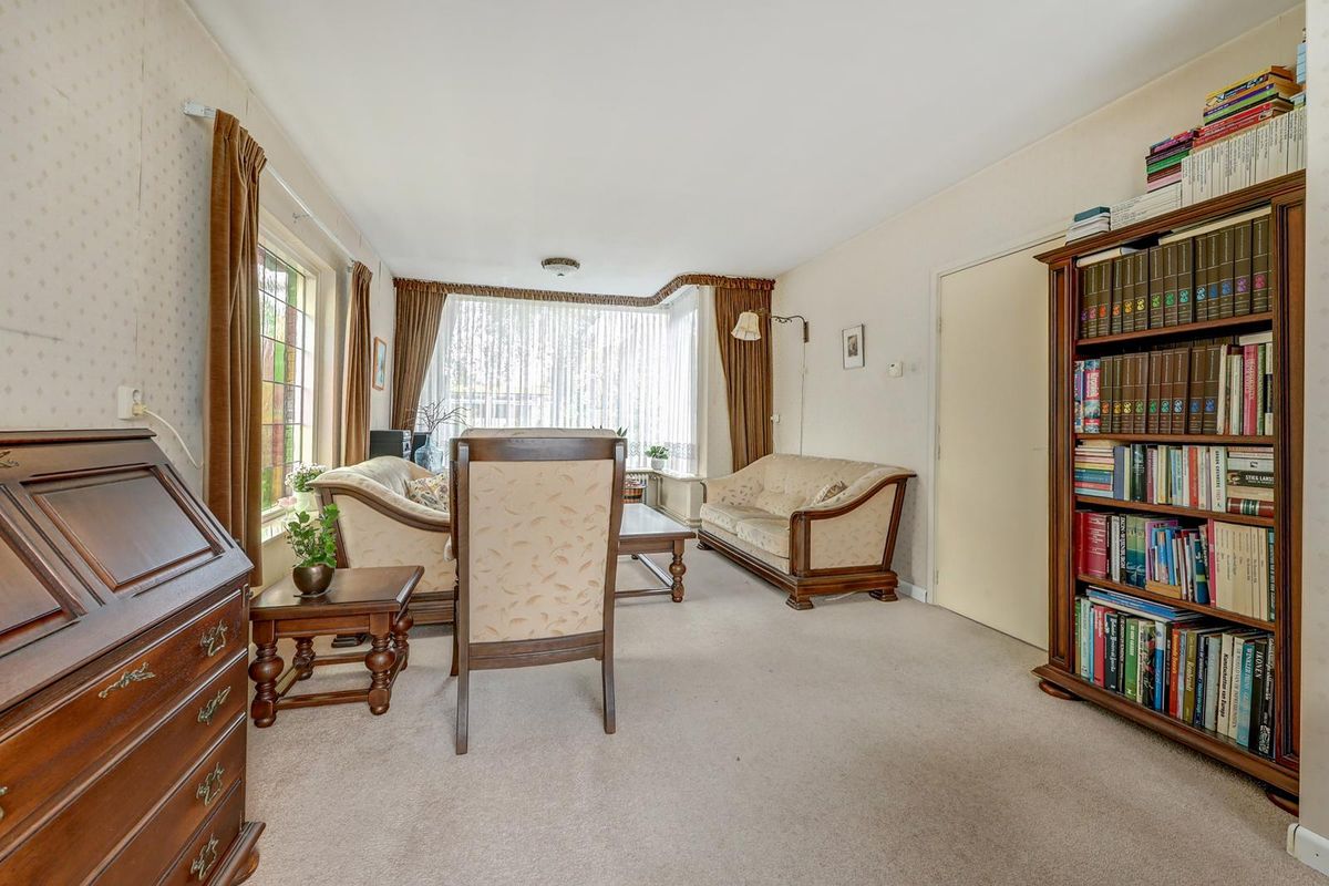 Via de ruime voortuin bereik je de entree van de woning. Je komt binnen in de hal met de meterkast, de praktische trapkast, het toilet en de trapopgang. De woonkamer voelt licht en ruim aan dankzij de karakteristieke erker aan de voorzijde en het extra zijraam met glas in lood.
