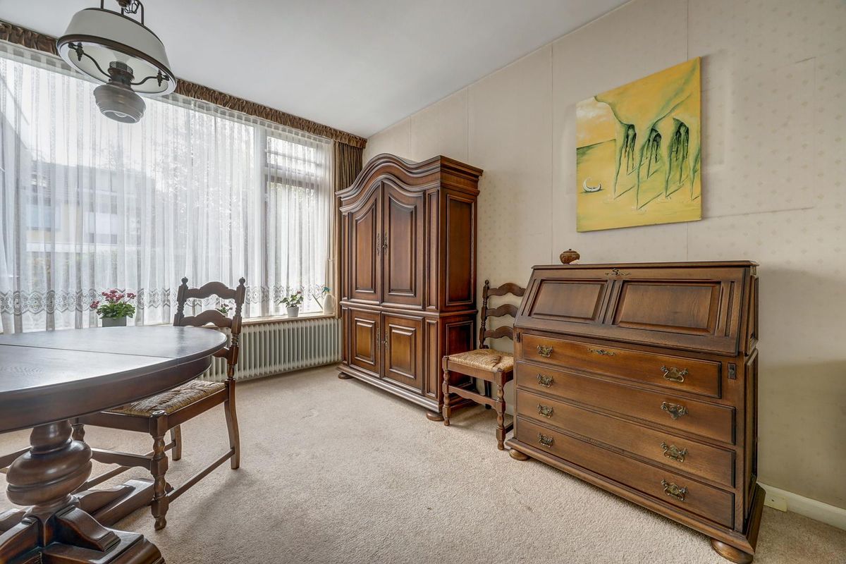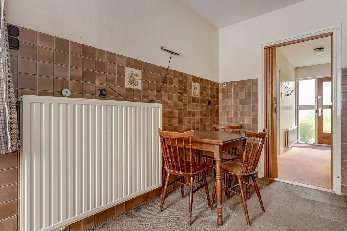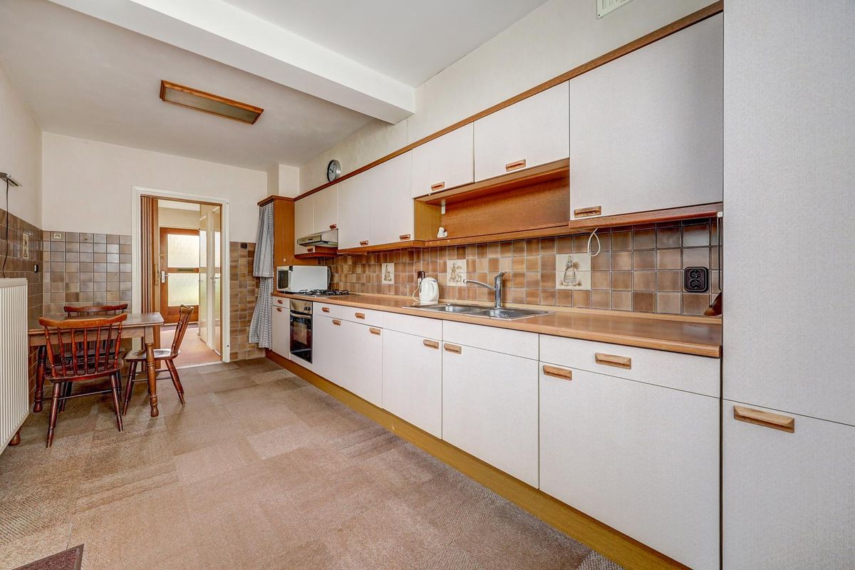 De keuken is aan de achterzijde uitgebouwd en daardoor een fijne en ruime plek om te koken en gezellig samen te komen. Vanuit de keuken stap je direct de achtertuin in, gelegen op het zuid-oosten en door de hoekligging extra breed. Achterin de tuin vind je de garage met handmatige roldeur.