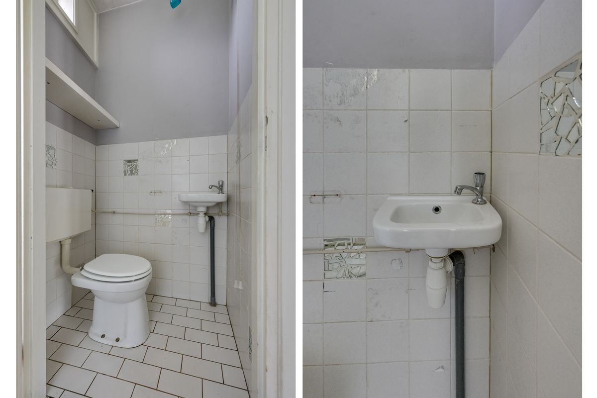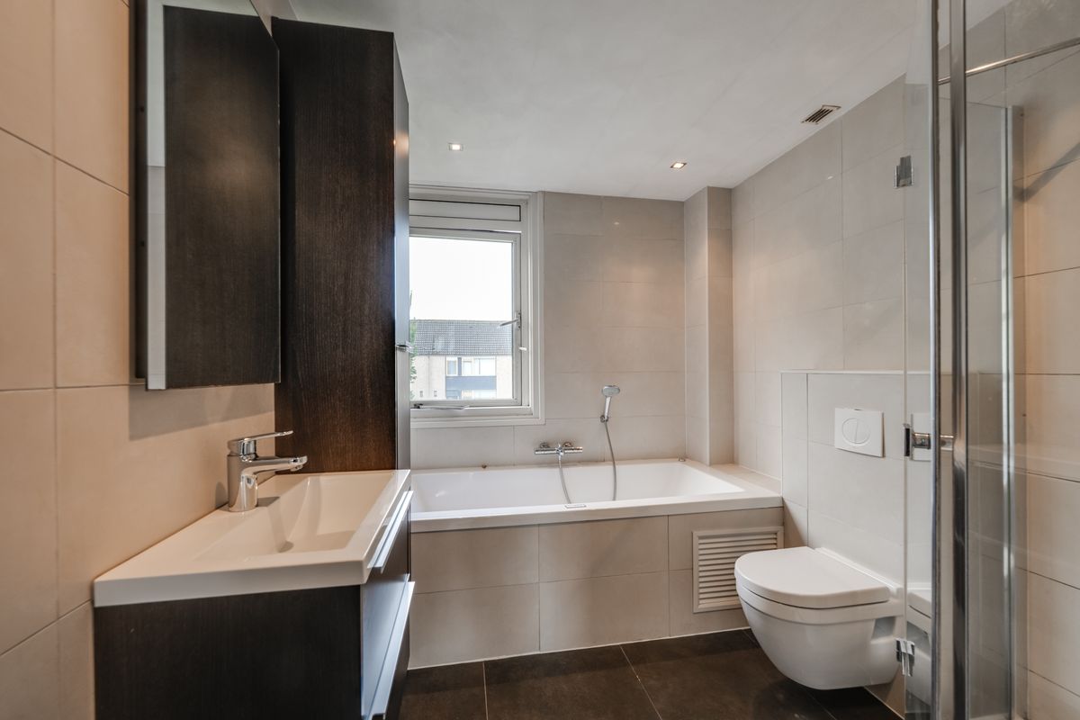 De geheel betegelde badkamer (2,55 m. x 2,20 m.) ligt aan de voorzijde en is v.v. een ligbad en een douchecabine, beiden v.v. een thermostaatkraan. Verder is er een hangend toilet en een wastafelmeubel met twee lades en een zwevende kast.