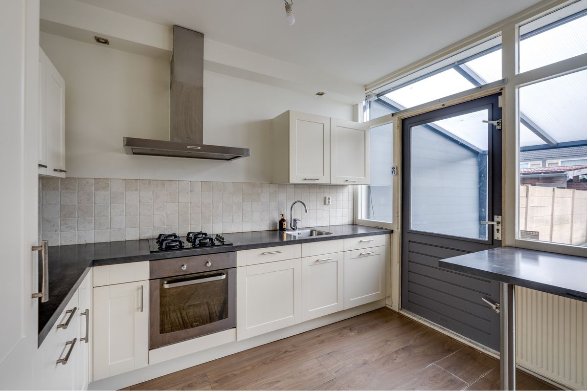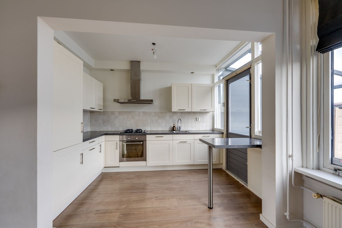 De open keuken (3,28 m. x 2,20 m.) ligt aan de achterzijde van de woning. Er staat een keukenblok in hoekopstelling met voldoende kastruimte in onder- en bovenkasten. De keuken is voorzien van een 4-pits gaskookplaat, een oven, een RVS afzuigkap, een vaatwasser en een koel-/vriescombinatie. De laminaatvloer is doorgetrokken vanuit de woonkamer. Het hardhouten kozijn met loopdeur geeft u toegang tot de achtertuin.