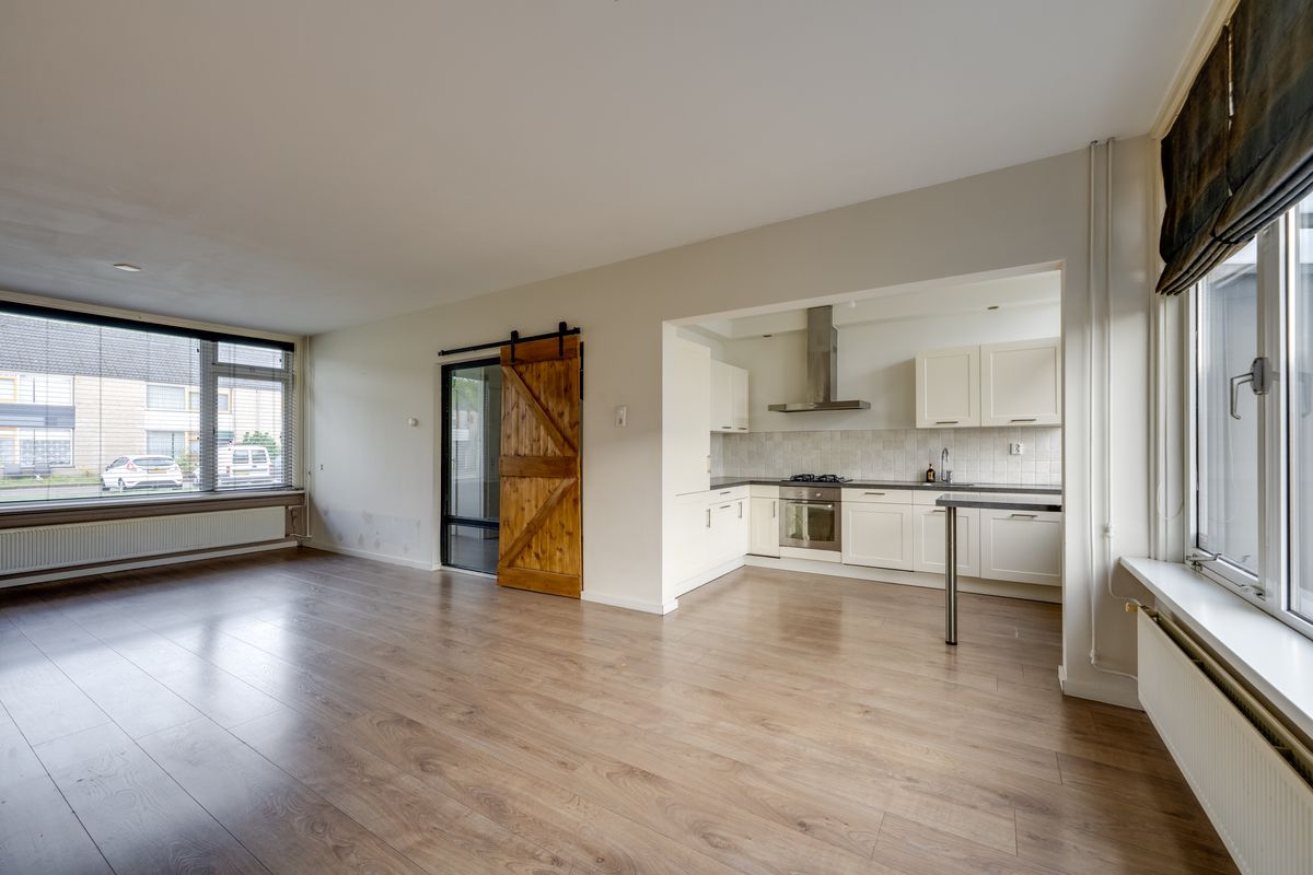 De woonkamer (8,10 m. x 4,01 m.) heeft een laminaatvloer. De wanden zijn glad afgewerkt en het plafonds is v.v. schuurwerk. De witte, aluminium kozijnen zijn v.v. HR+ glas. De ruimte is v.v. airconditioning.