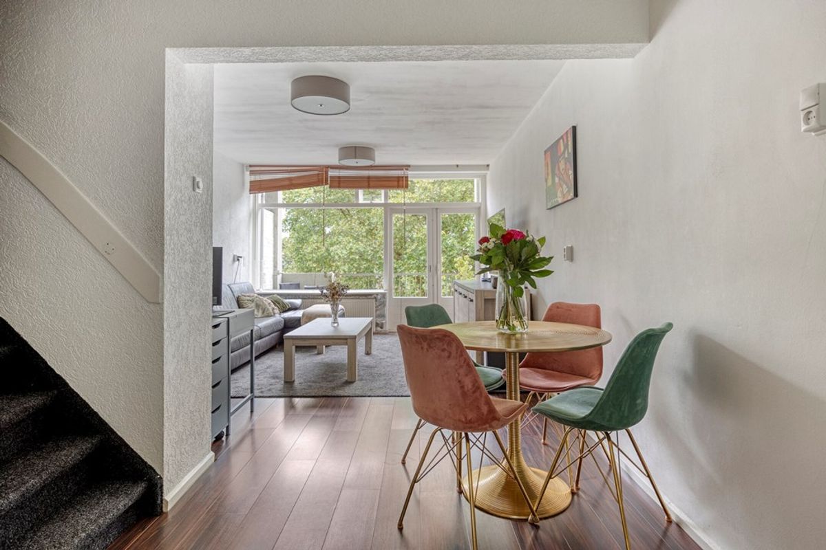De lichte woonkamer bevindt zich aan de achterzijde en strekt zich uit over de volle breedte van de woning. Aansluitend is er ruimte voor een eethoek.