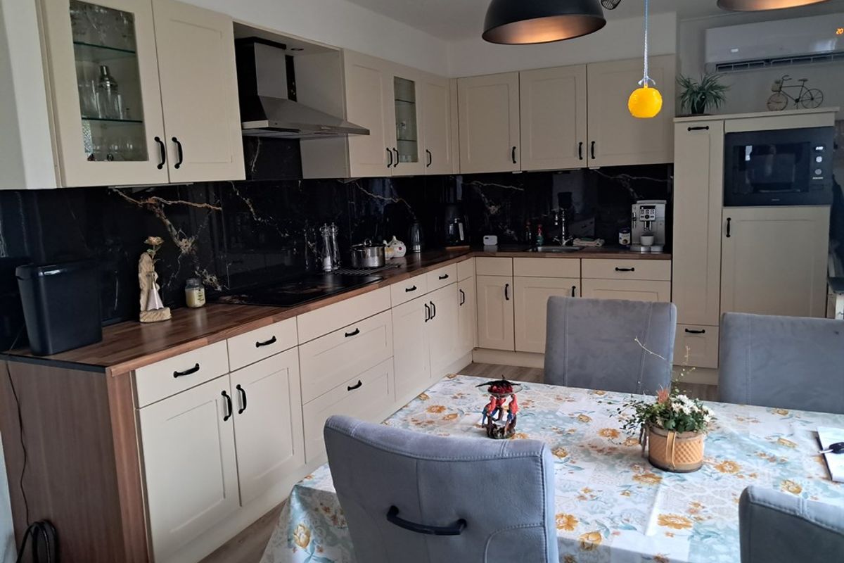 Vanuit de hal, met toilet, trapopgang en kelderkast, kom je in de L-vormige woonkamer met schuifpui. In de aangesloten woonkeuken vind je een keukeninrichting in hoekopstelling met diverse inbouwapparatuur (vernieuwd in 2024). Airco in de keuken aanwezig voor koeling en verwarming.