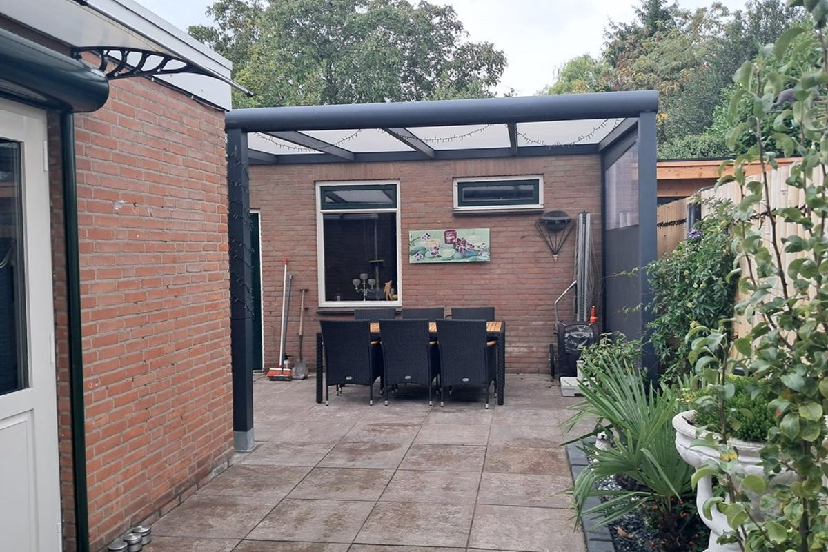 De achtertuin is onderhoudsvriendelijk aangelegd en gelegen op het westen. In de achtertuin, met achterom, heb je veel privacy. De ruime stenen berging, met overkapping, heeft een oppervlakte van circa 28 m².