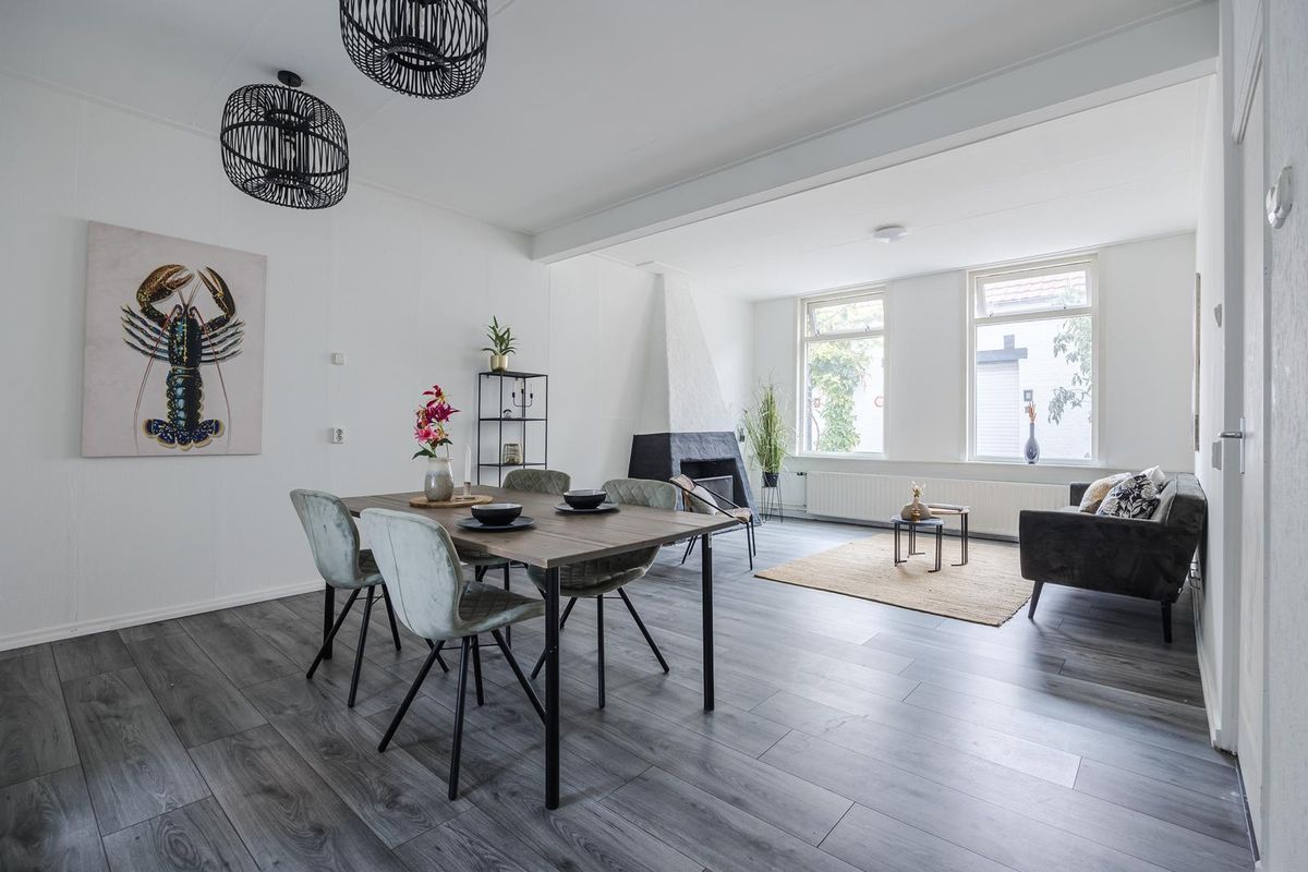 De woonkamer is licht, heerlijk ruim en voorzien van een laminaatvloer en sfeervolle openhaard. Er is veel lichtinval door de raampartijen.