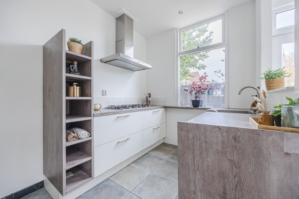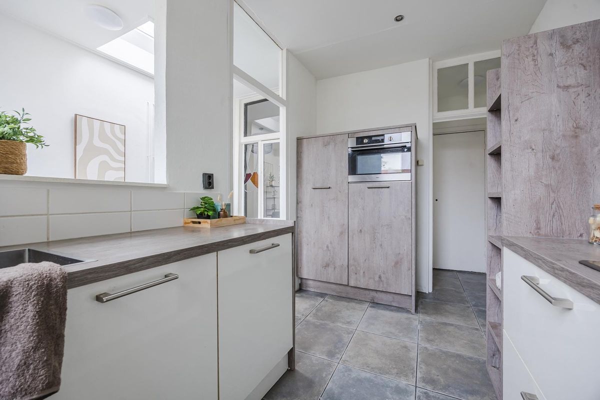 De keuken met zicht op de tuin is voorzien van een tegelvloer, inbouwkast en inbouwapparatuur: inductie kookplaat, koelkast, vaatwasser, afzuigkap en een combi-oven. Via de keuken kunt u naar de bijkeuken, toilet en naar de badkamer.