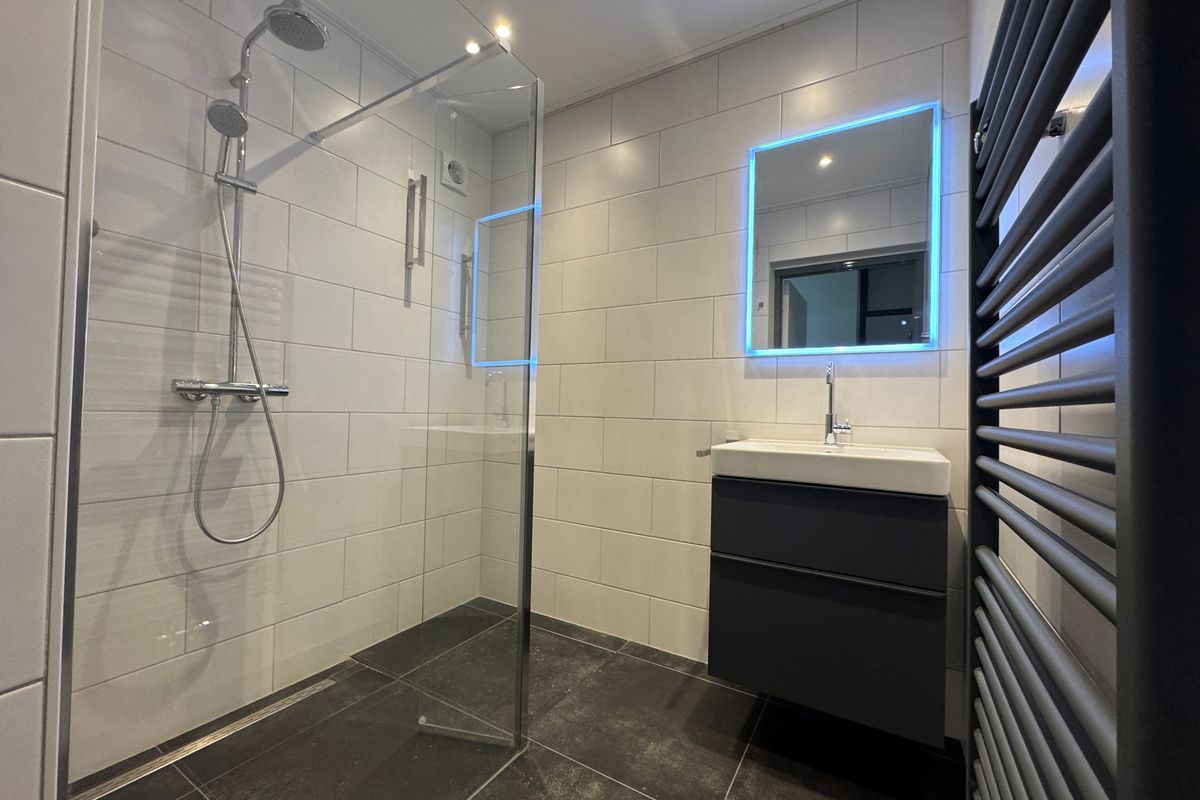 – Nieuwe badkamer met modern wastafelmeubel en inloopdouche