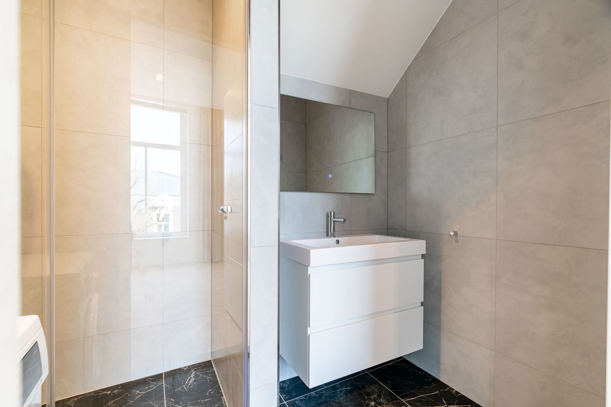 There is a separate bedroom present with an adjacent bathroom. The sleek bathroom is fully fitted with a walk-in shower, a vanity with wash basin and mirror, and a washer-dryer. A separate toilet is present.