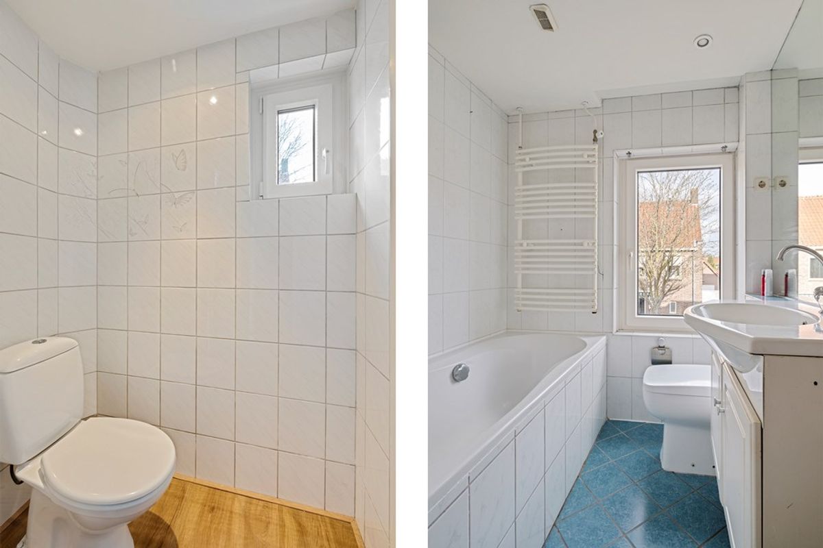 De badkamer is keurig betegeld en voorzien van een ligbad, wastafelmeubel, toilet en designradiator. Dankzij het aanwezige raam profiteert u ook hier van natuurlijke ventilatie en daglicht.