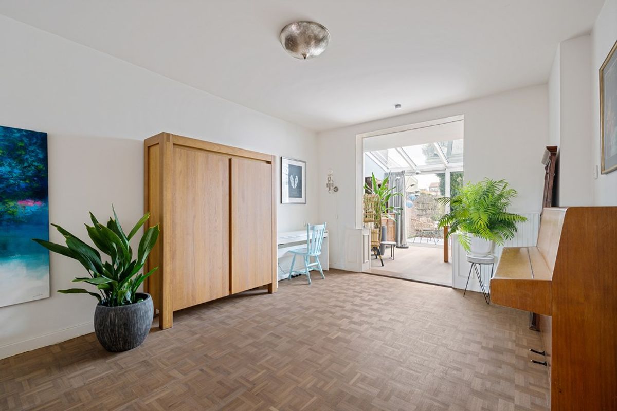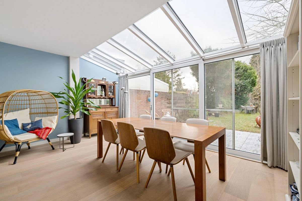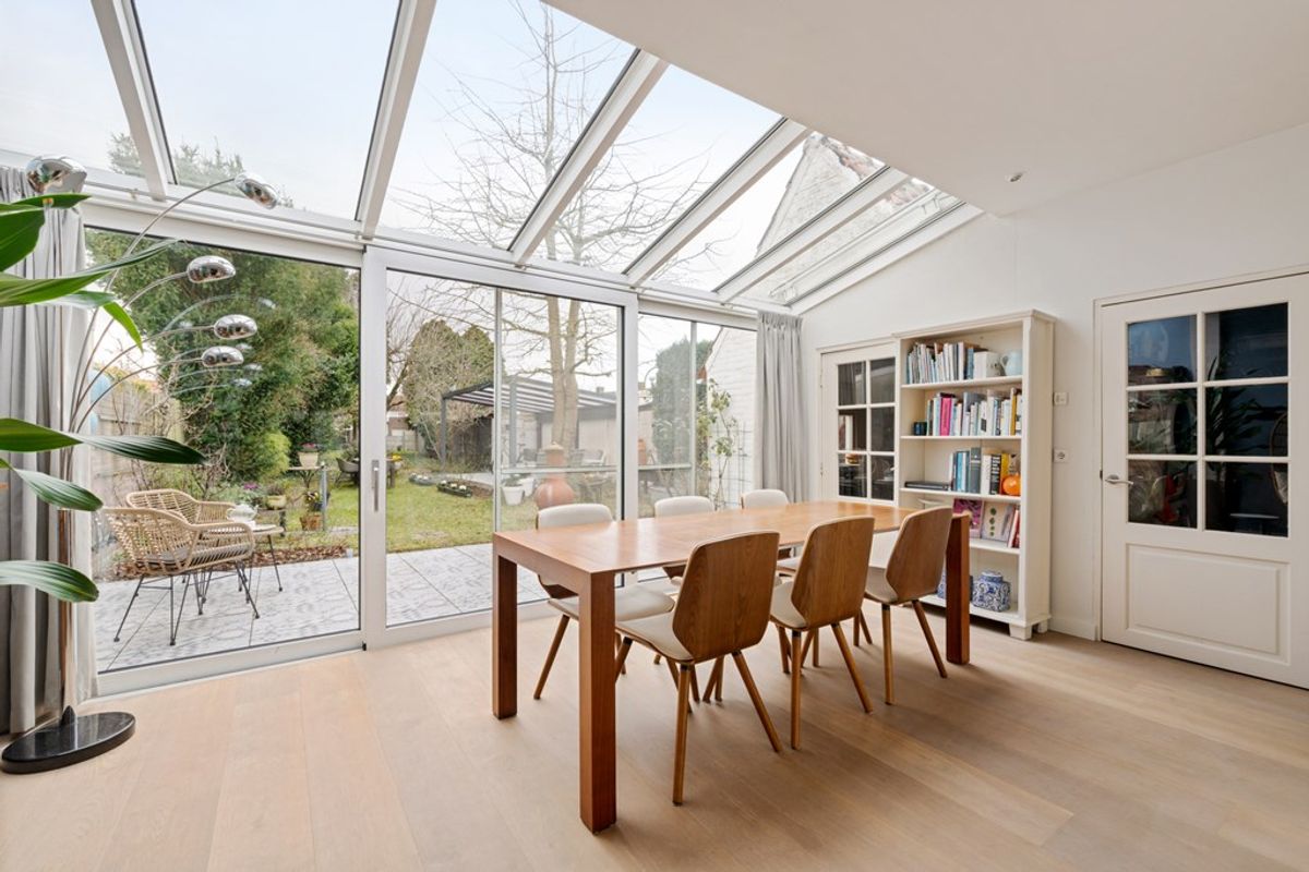 De hal biedt toegang tot de woonkamer. Deze ruime living is voorzien van een parketvloer, strak afgewerkte wanden en grote raampartijen aan de voor, en achterzijde, die zorgen voor prettige lichtinval. Aan de achterzijde loopt de woonkamer over in een lichte serre/eetkamer met een glazen dakconstructie, een schuifpui en fraai uitzicht op de tuin. Hierdoor ontstaat een heerlijke extra leefruimte met volop daglicht.