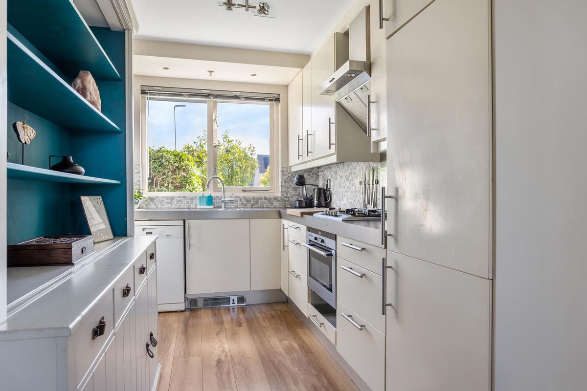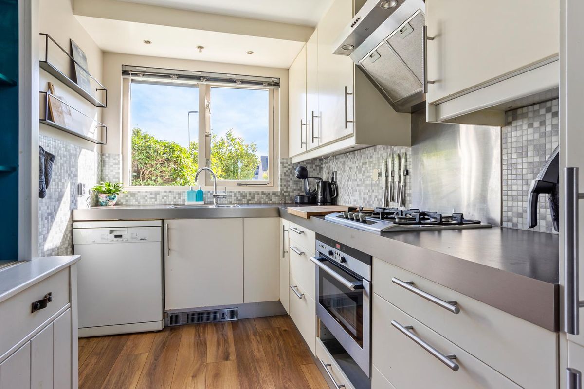 Het toilet is tijdloos en praktisch, voorzien van een hangend toilet, een nis en een ingebouwde toiletrolhouder. De berging is zowel van binnenuit als buitenaf bereikbaar en herbergt de CV-ketel. Aan de voorzijde bevindt zich de L-vormige keuken in neutrale kleurstelling, uitgerust met moderne inbouwapparatuur: gaskookplaat, oven, koelkast, vriezer en een losstaande vaatwasser (gaat mee). Er is tevens plintverwarming aanwezig.