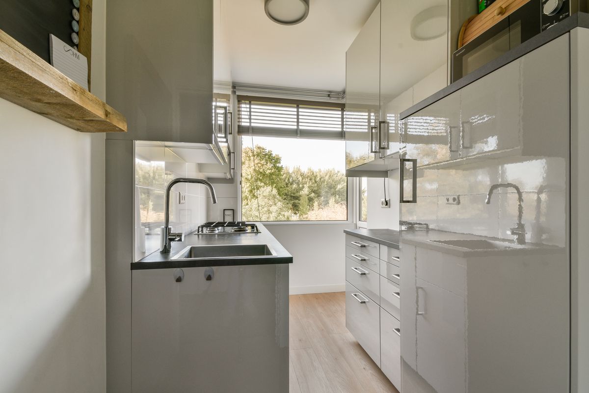 Het appartement beschikt over twee goed bemeten slaapkamers, een moderne badkamer met douche, wastafelmeubel en wasmachineaansluiting, en een gesloten keuken met strak keukenblok en inbouwapparatuur. De badkamer en cv-installatie (Remeha) zijn recent vernieuwd (2020).