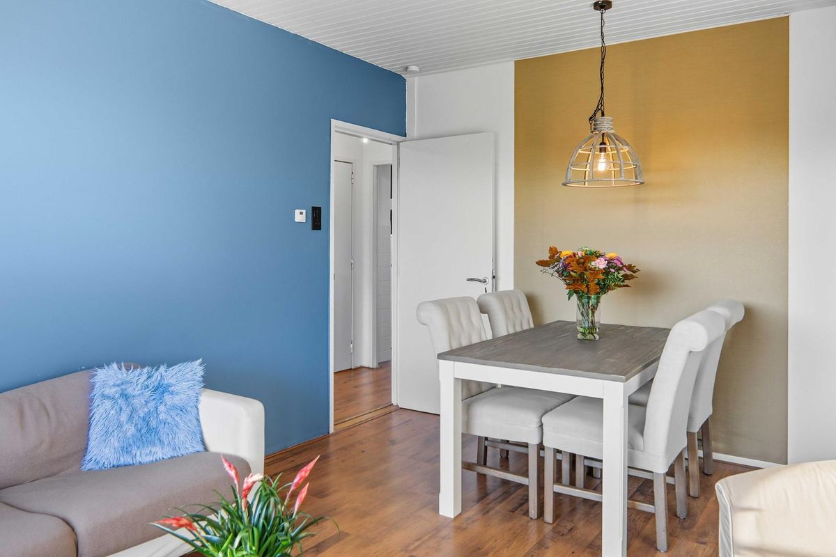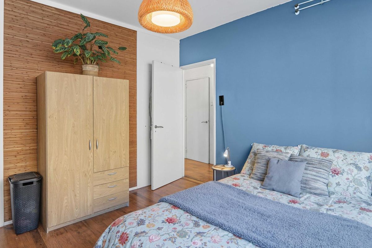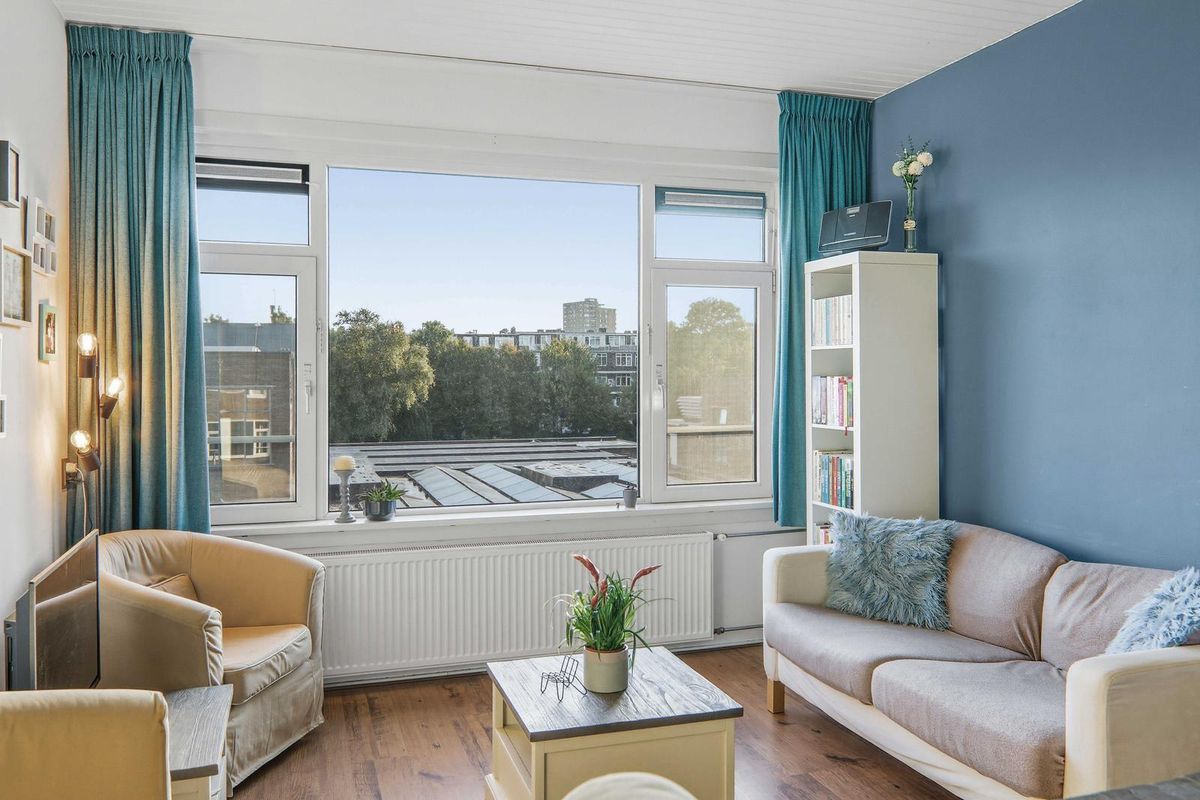 De lichte woonkamer met de typische grote raampartijen van Bergpolder zorgt voor een prettige sfeer. Daarnaast zijn er twee slaapkamers – één ruimere en een kleinere, ideaal als werk- of logeerkamer.