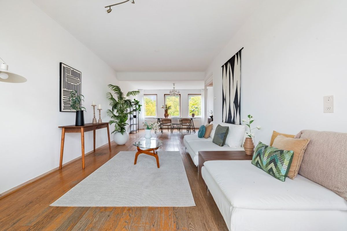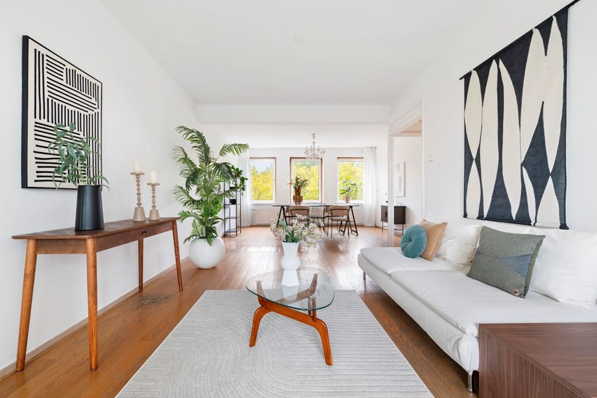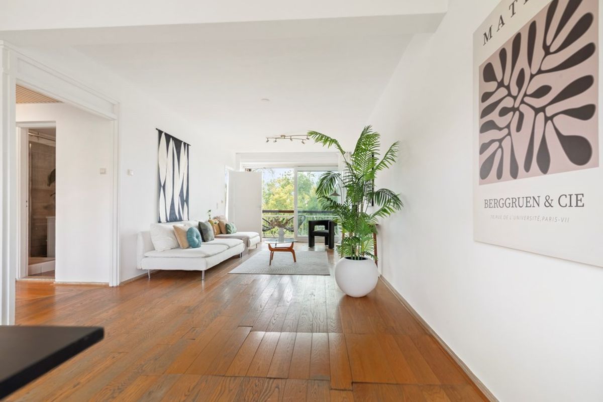 Upon entering the apartment, you are welcomed by a spacious hallway providing access to all rooms. The bright living and dining room extends across the entire depth of the apartment, offering large windows on both sides for maximum daylight. A sliding door opens onto the sunny south-facing balcony, the perfect spot to relax and enjoy the green surroundings.