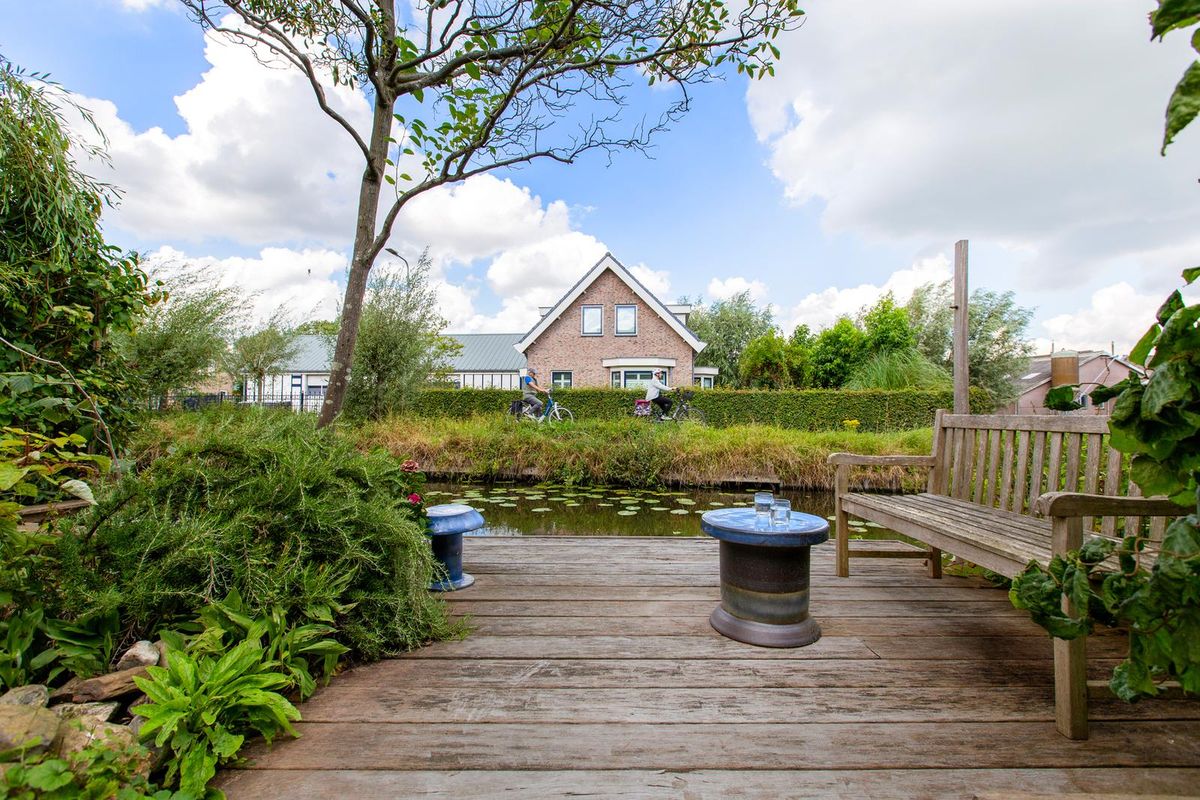 De woonkamer is heerlijk licht en dankzij de grote raampartij aan de achterzijde heeft u goed zicht op de achtertuin aan het water. In de woonkamer treft u een sfeervolle hout gestookte haard. Via een openslaande deur bereikt u de zonnige achtertuin op het noord westen. Deze is voorzien van klinkers met groene borders en een vlonder aan het water. Vanuit hier kunt u genieten van het landelijke uitzicht. Een zonnescherm aan de achterpui zorgt dat u hier, indien gewenst, in de schaduw kunt zitten. De tuin beschikt tenslotte nog over een waterkraan, waterpomp en diverse elektriciteitspunten.