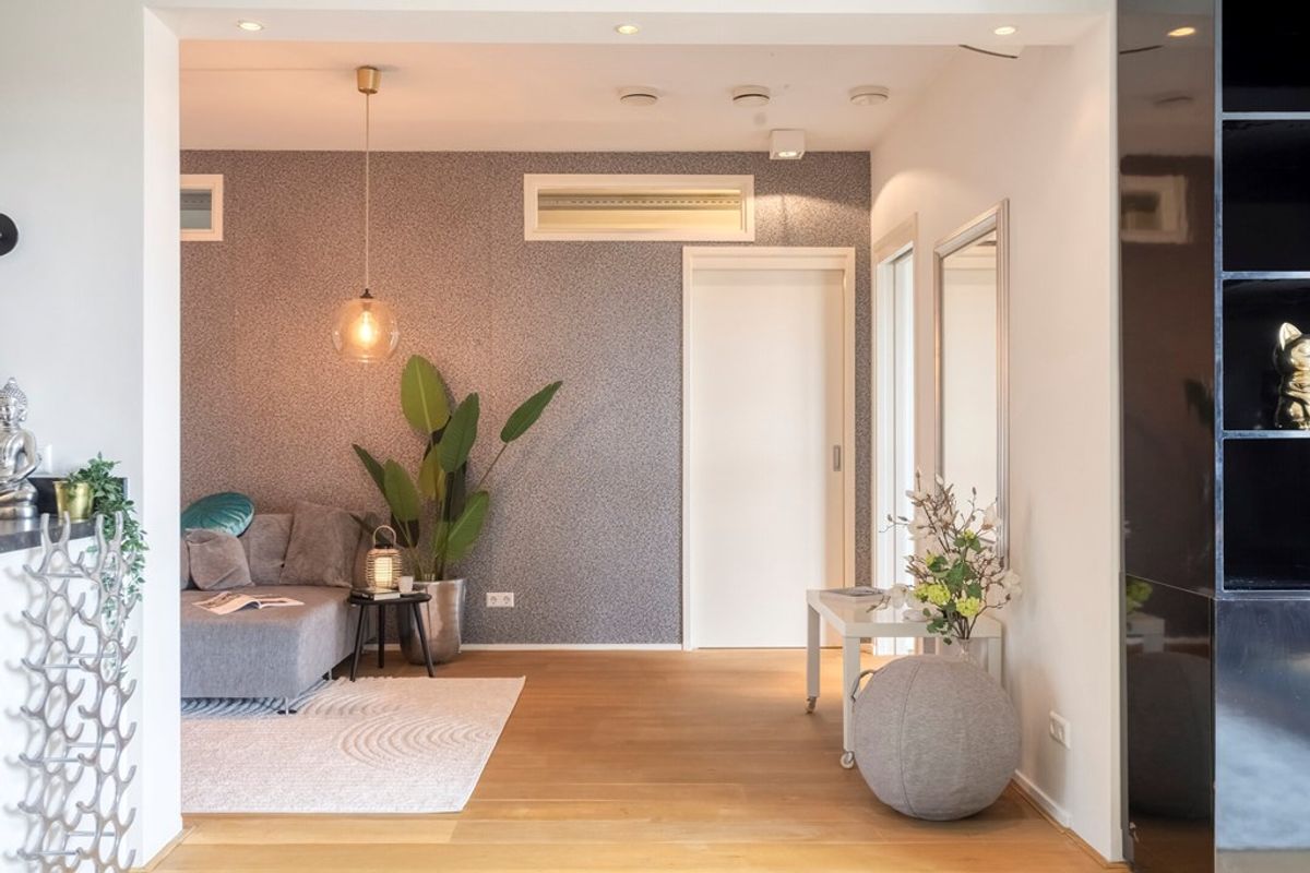 Er is vloerverwarming door het hele appartement en men komt binnen via de hal met gasten toilet, waarna men in de huiskamer met uitzicht op het westen belandt. De houten vloer geeft dit huis een warme sfeer en door de grote ramen komt overal het licht binnen. Het lijkt wel alsof het in dit huis altijd zomer is.
