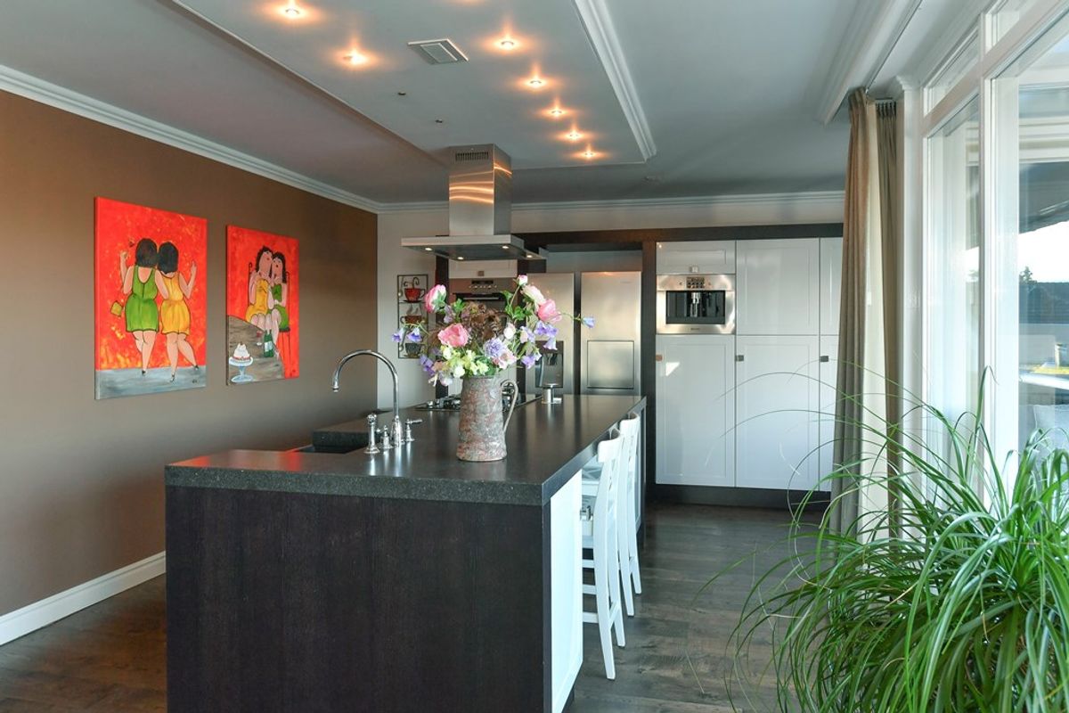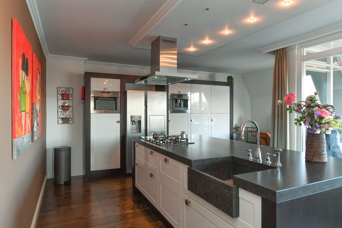 De moderne open keuken is uitgevoerd met een royaal kookeiland en hoogwaardige inbouwapparatuur. De keuken staat in directe verbinding met de living en vormt daarmee een elegante en functionele leefruimte.