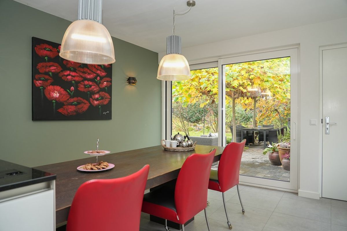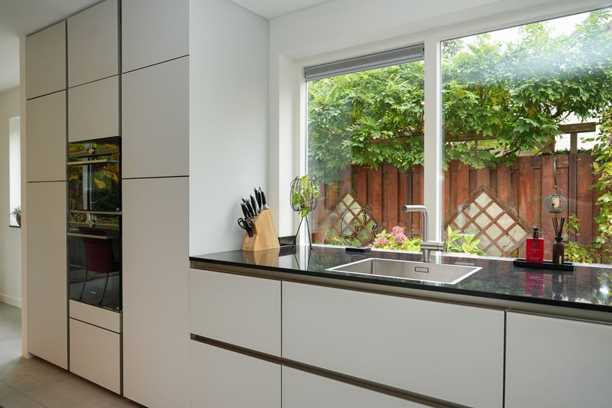Via de lichte aluminium schuifpui (die zeer soepel en licht te bedienen is) staat de keuken in directe verbinding met de tuin, ideaal voor binnen-buiten leven.