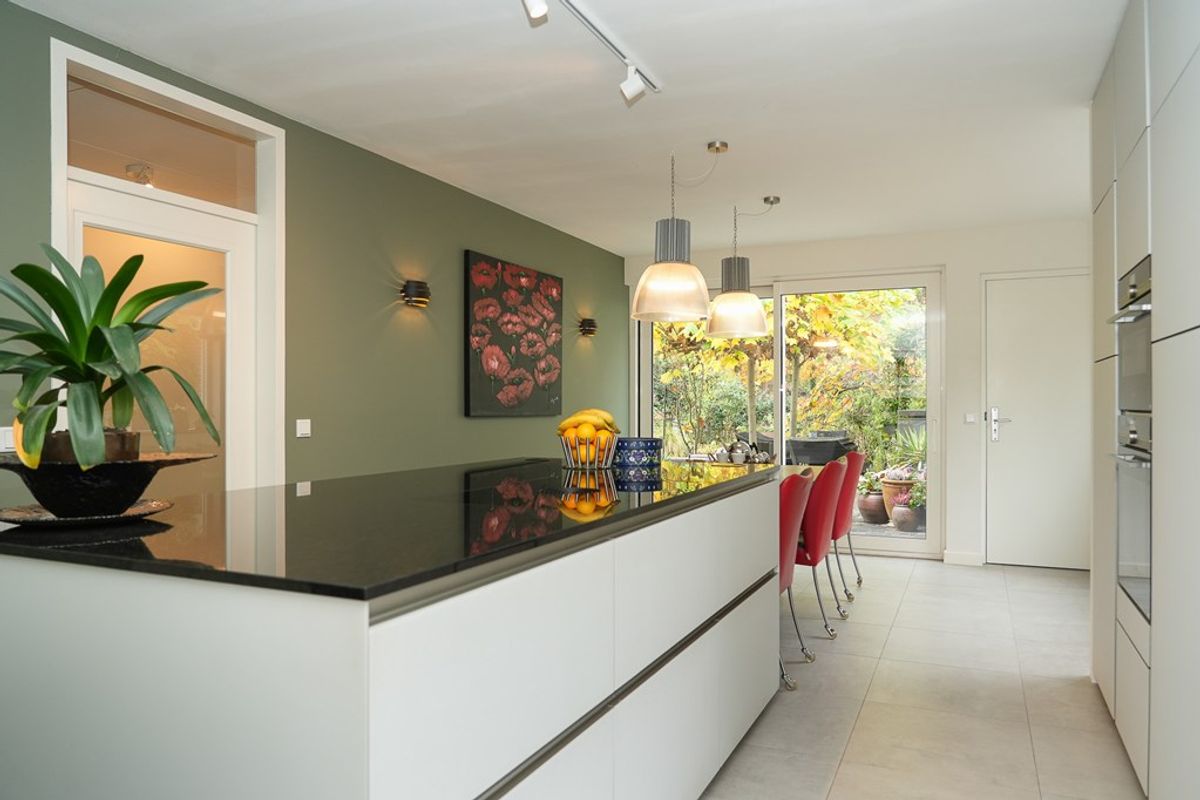 De woonkeuken is zonder twijfel het middelpunt van de woning. Deze vormt het hart van de woning en is in 2023 volledig vernieuwd. De hoogwaardige designkeuken uit Duitsland is uitgevoerd in glas en voorzien van luxe inbouwapparatuur, waaronder een Bora inductiekookplaat met geïntegreerde afzuiging, een combi-oven, separate oven, grote koelkast en vriezer. Een lichtarchitect heeft de keuken ontworpen, waardoor verschillende sferen mogelijk zijn – van helder werklicht tot sfeervol dimlicht in de avond.