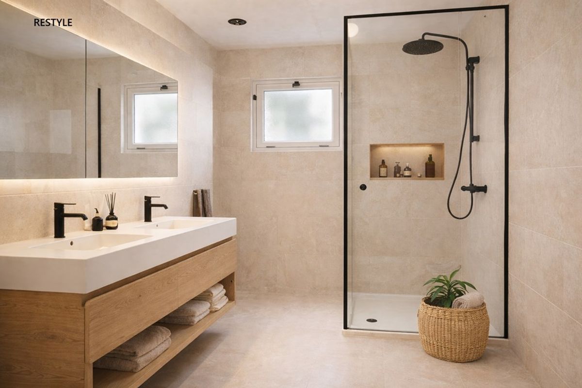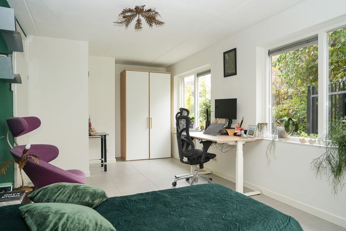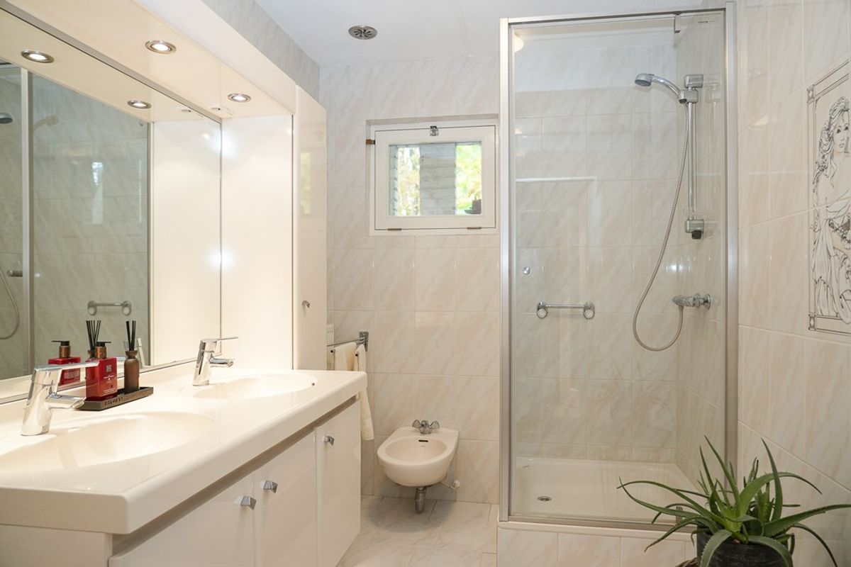 Aan de tuinzijde bevindt zich een ruime slaapkamer met rolluiken voor volledige verduistering. De aangrenzende badkamer beschikt over een douchecabine, bidet en dubbele wastafel. Deze indeling maakt comfortabel gelijkvloers wonen mogelijk.