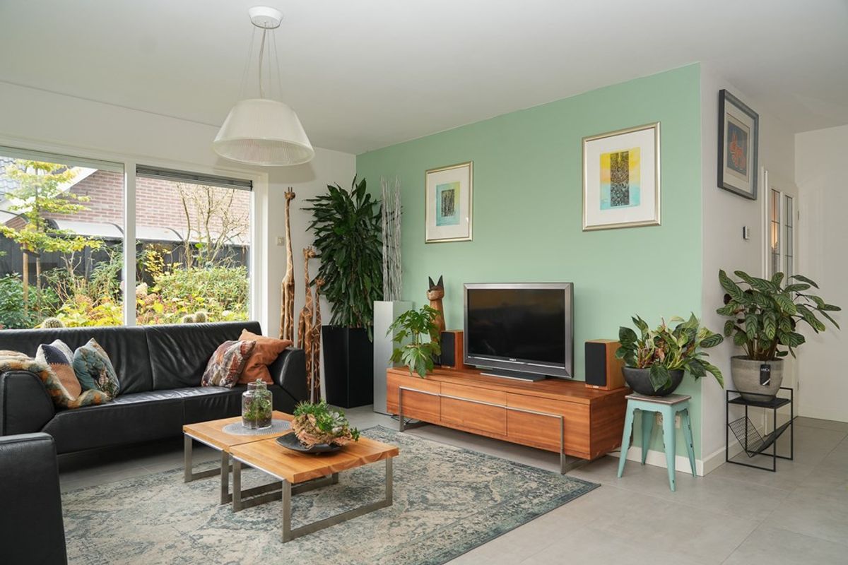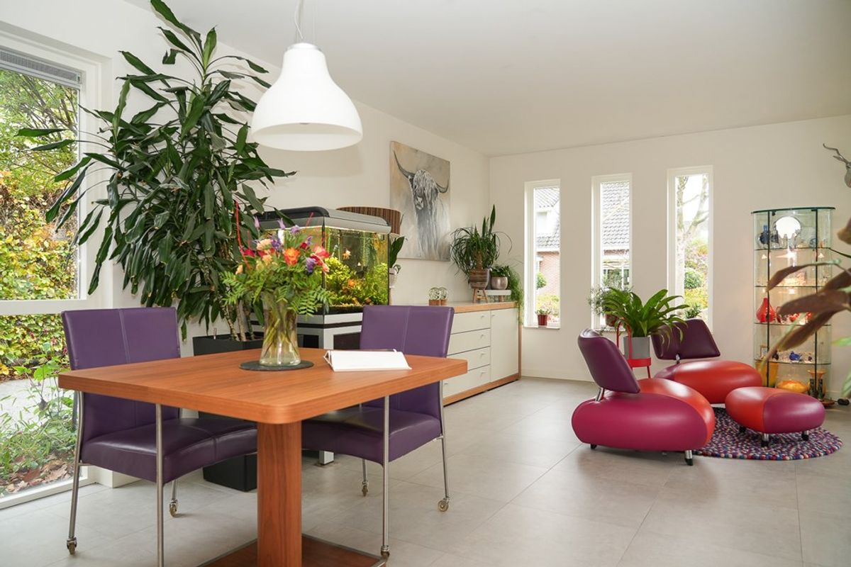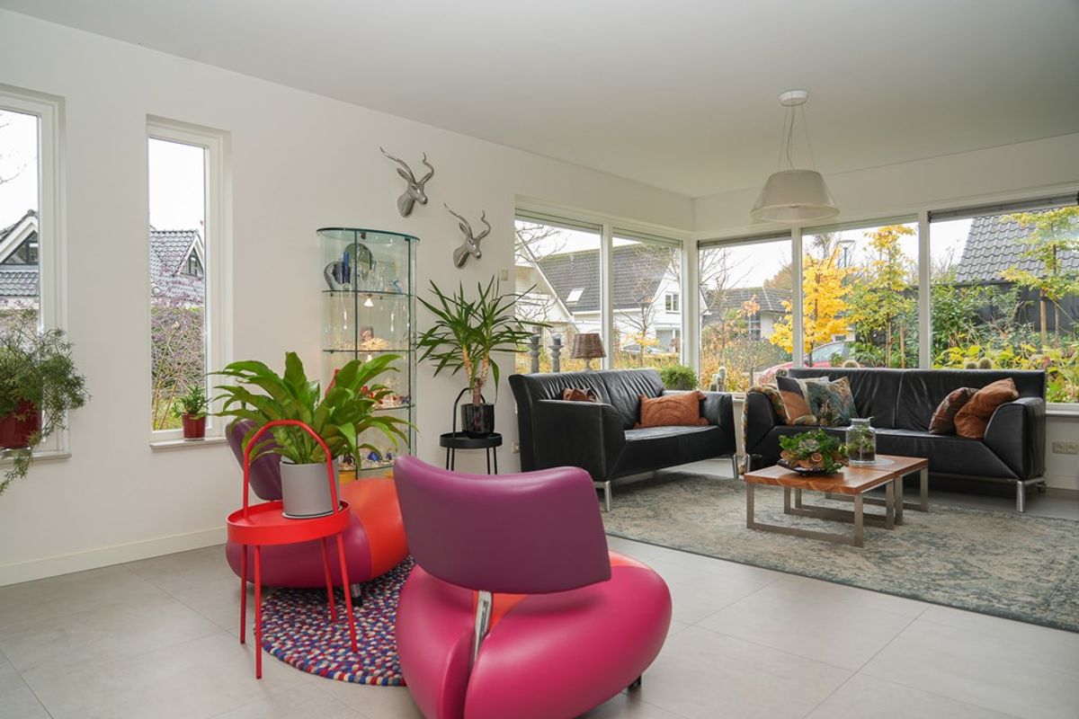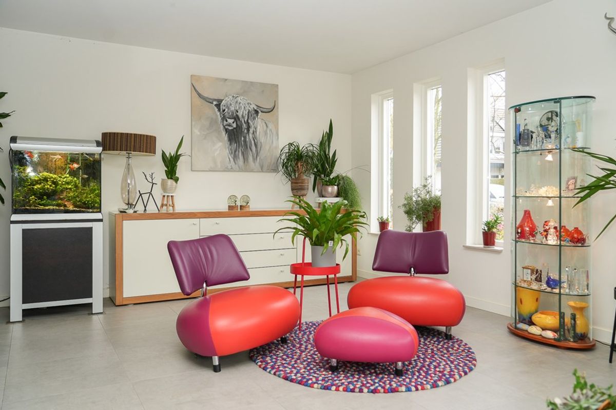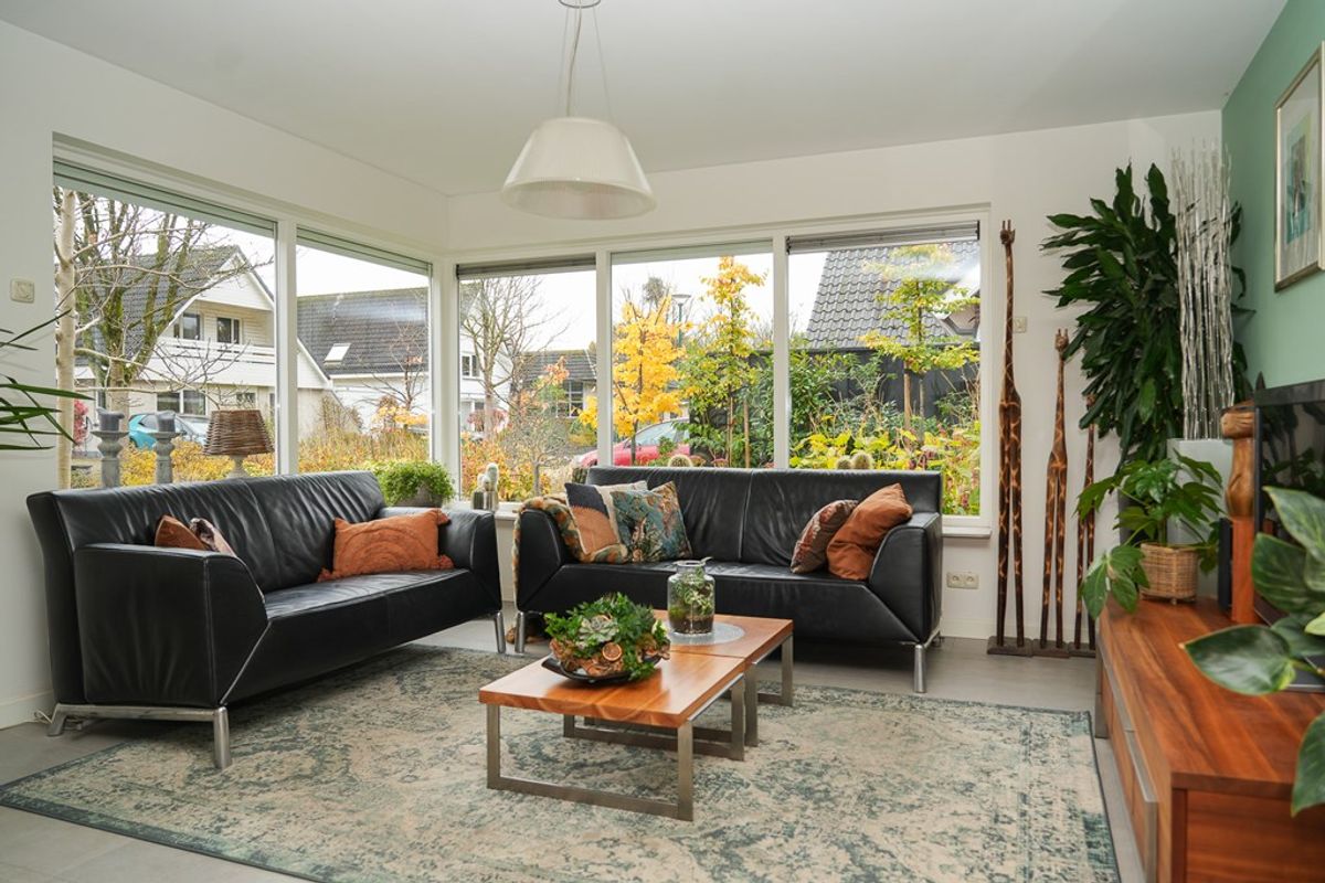 De royale woonkamer aan de voorzijde is heerlijk licht dankzij de grote raampartijen. In 2022 is de begane grond voorzien van strak stucwerk en comfortabele vloerverwarming, wat zorgt voor een moderne uitstraling en optimaal wooncomfort. De ramen zijn voorzien van rolluiken en screens aan de buitenzijde zorgen voor extra verkoeling op warme dagen.