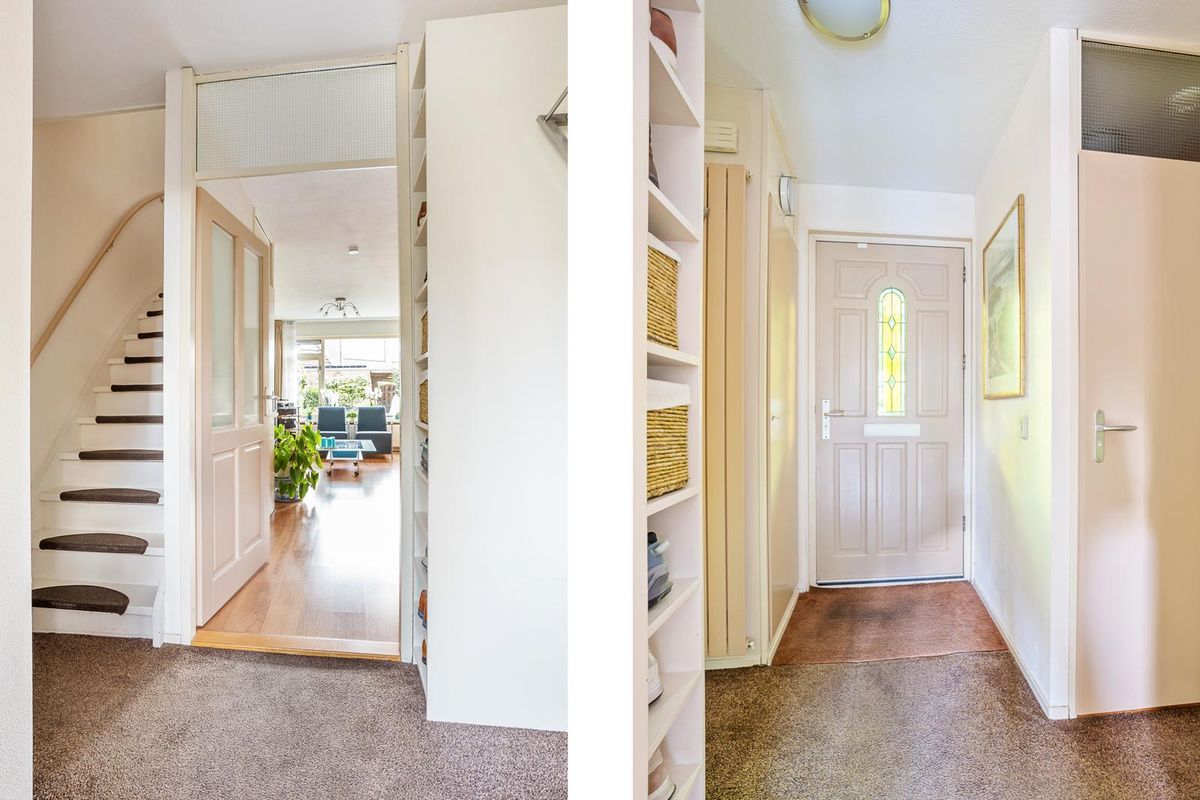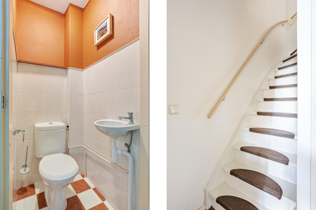 Aan de voorkant is een kleine voortuin en overdekte entree. In de hal bevindt zich de meterkast, toilet en trap naar de verdieping. Het toilet is uitgevoerd met fonteintje en betegeld in een combinatie van crème en terracotta. Vanuit de hal betreedt u de lichte woonkamer met grote raampartij en een loopdeur naar de achtertuin. Aan de voorzijde van de woning bevindt zich de halfopen keuken, voorzien van diverse inbouwapparatuur waaronder een koelkast, vriezer, oven, vijfpits gaskookplaat en vaatwasmachine. De keuken is uitgevoerd in een neutrale kleurstelling. In de woonkamer en keuken ligt een nette laminaatvloer.