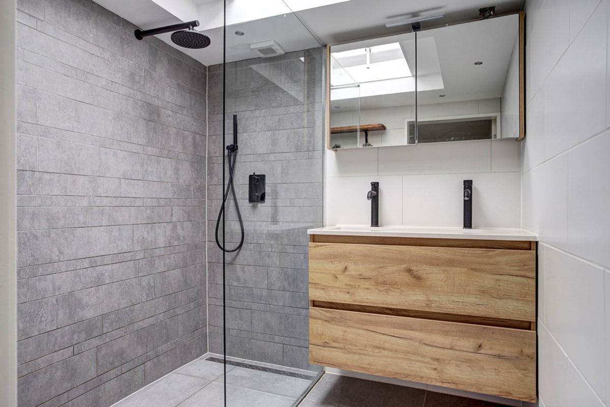 Boven vind je twee ruime slaapkamers. De slaapkamer aan de voorzijde beschikt over praktische vaste kasten, terwijl de kamer aan de achterzijde toegang biedt tot een fijn balkon. De moderne badkamer (2019) is volledig betegeld en voorzien van een inloopdouche, dubbele wastafel en daklicht – een plek om de dag ontspannen te beginnen.