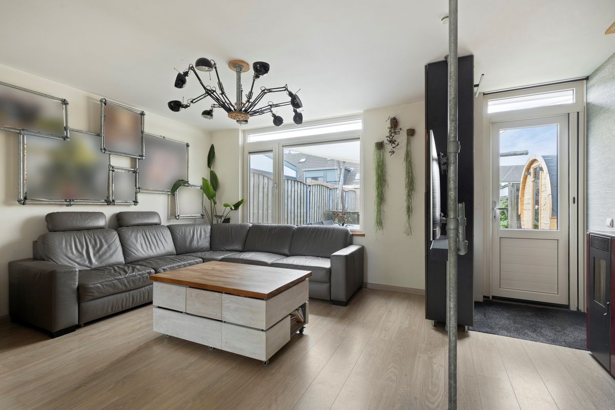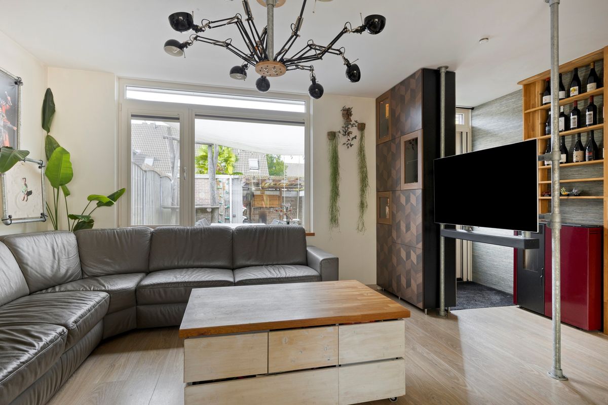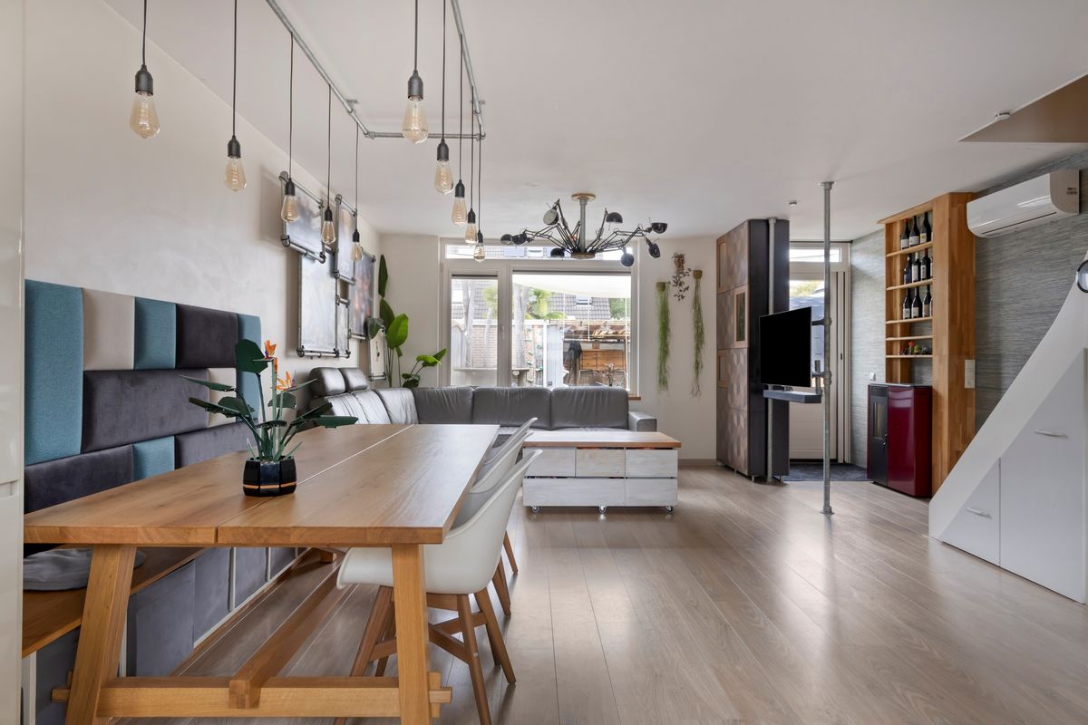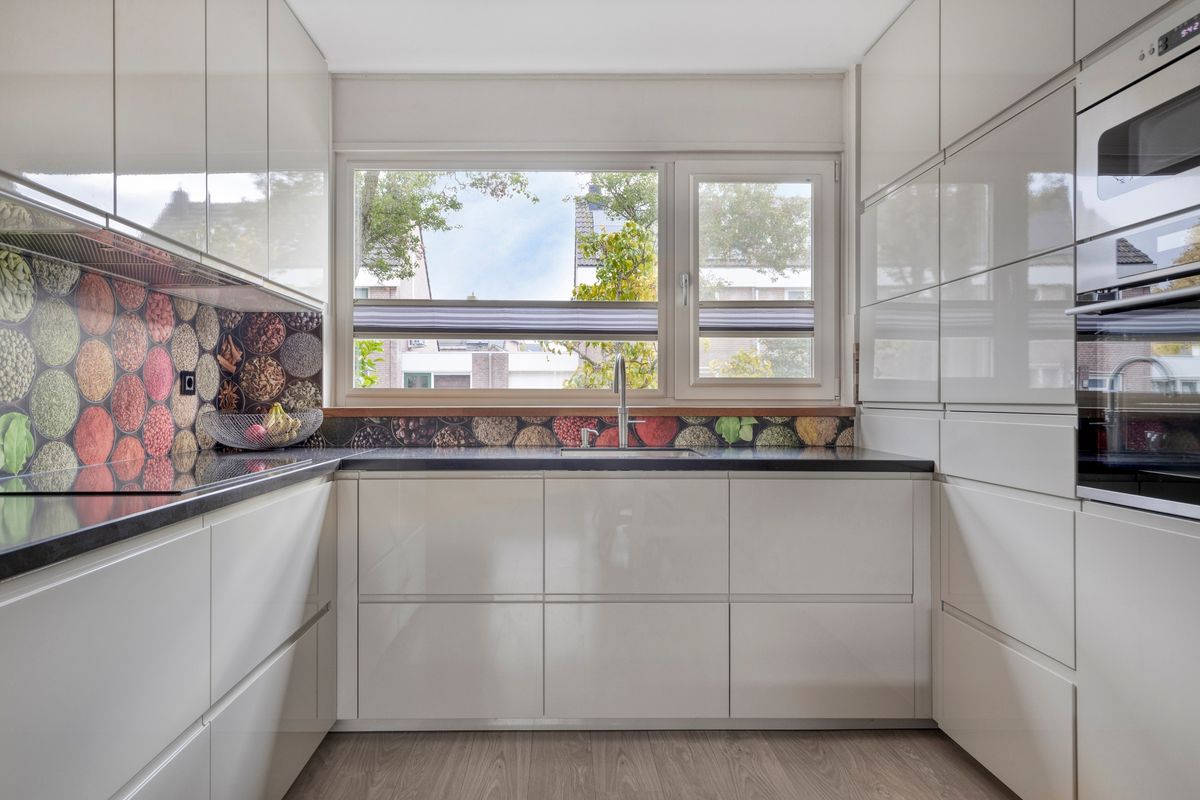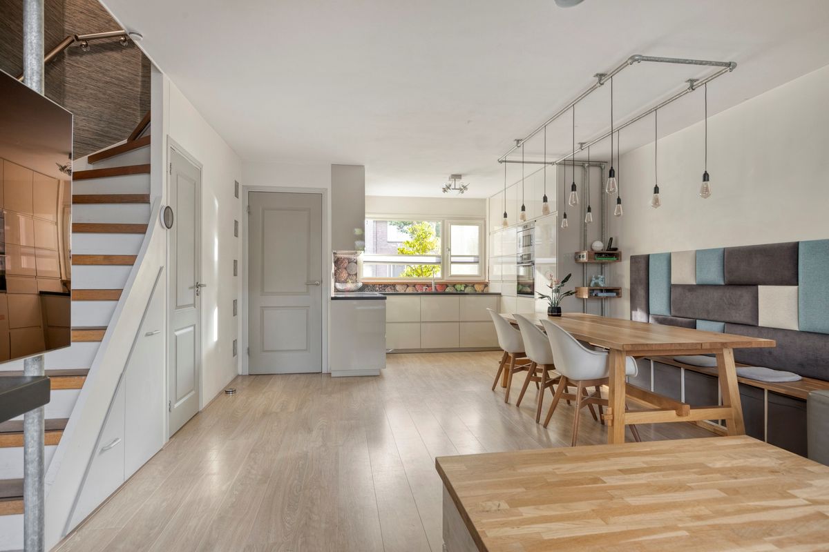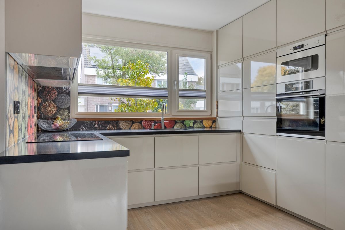 In de woonkamer bevindt zich de trapopgang naar de eerste verdieping. Onder deze trapopgang zijn een trapkast en ladekasten gesitueerd welke zorgen voor extra bergruimte. De keuken in L-vorm is v.v. diverse kasten en lades, een composiet werkblad met spoelbak en kokend waterkraan (Quooker met gekoeld, bruis en gefilterd water), een inductiekookplaat, afzuigkap, magnetron, oven, koelkast met vriesvak (Bosch) en vaatwasser (Siemens). Tevens is er in 1 van de kastjes een extra afzuigkap aanwezig t.b.v. bijvoorbeeld een airfryer of friteuse. De keuken is aan de voorzijde van de woning gelegen. Het woongedeelte is aan de achterzijde van de woning gelegen. In de woonkamer zijn een pellet kachel en airconditioning aanwezig welke zorgen voor de verwarming op de begane grond. De vloer van de begane grond is v.v. laminaat. De wanden en plafonds zijn afgewerkt met stucwerk. De kozijnen zijn van kunststof en v.v. HR++ glas. Het toilet is deels betegeld en v.v. een hangend toilet en fonteintje.