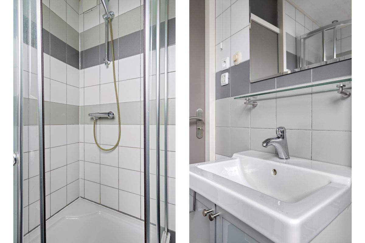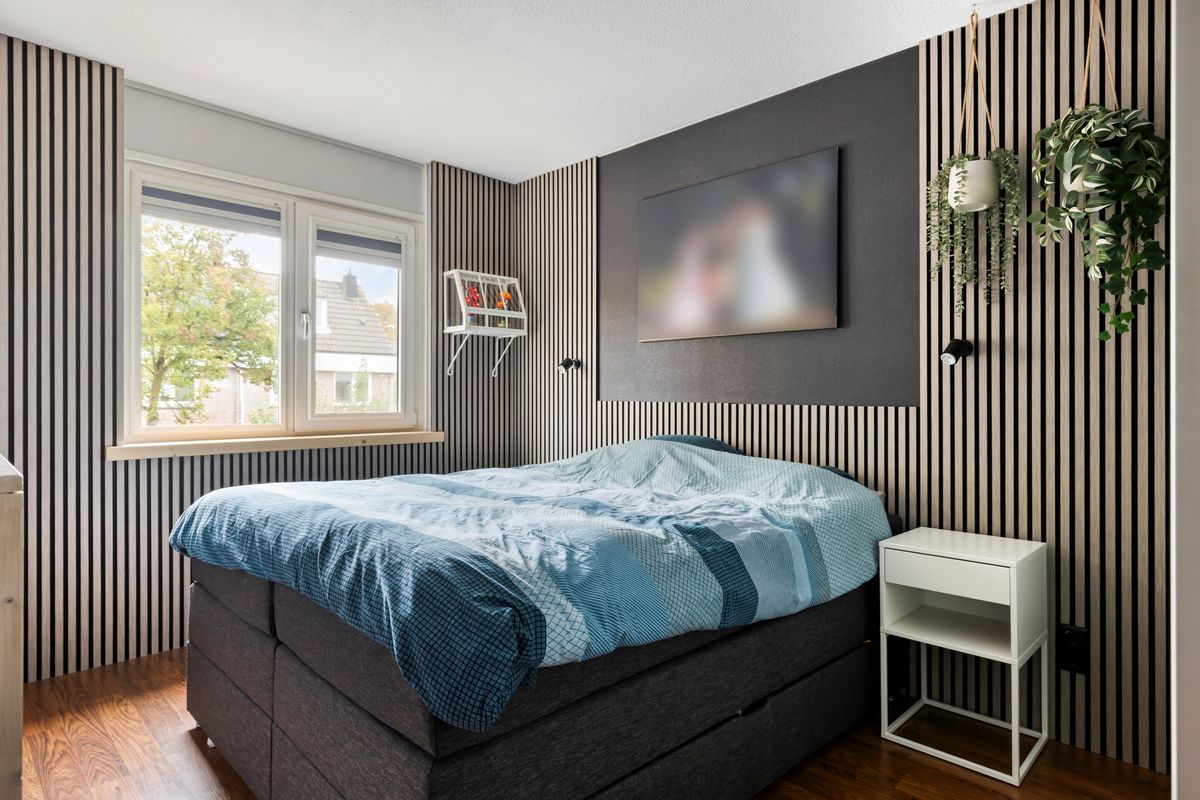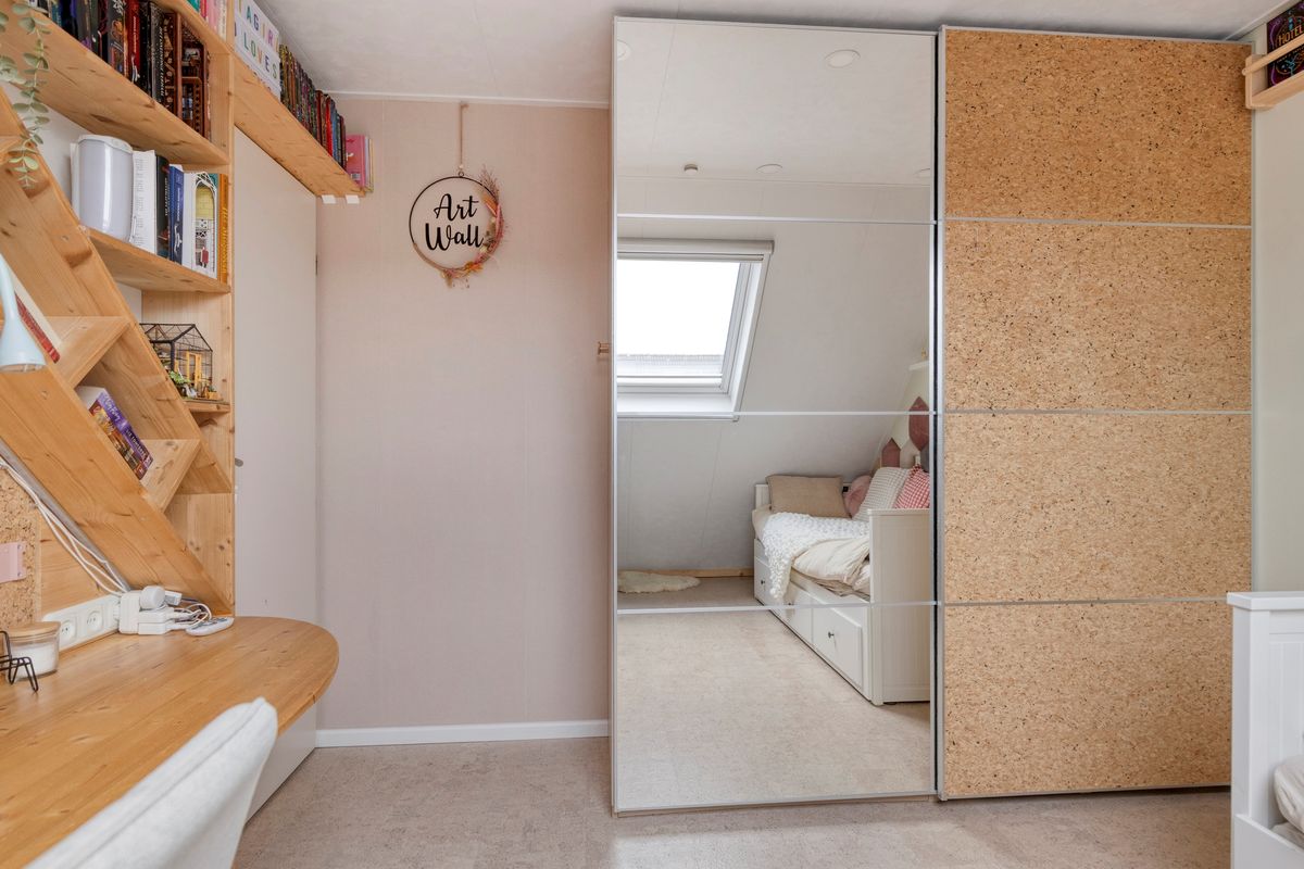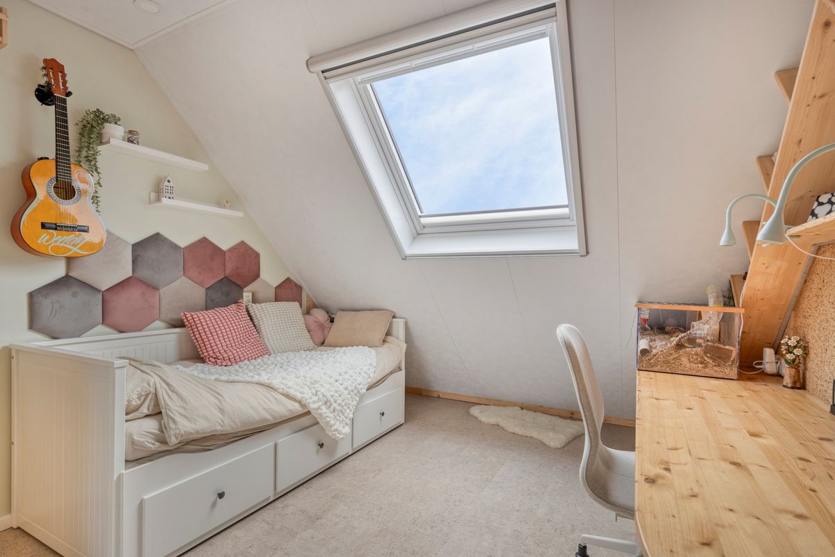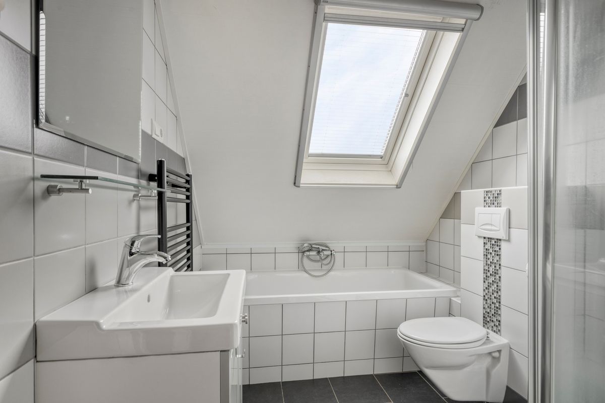 Vanuit de overloop zijn 3 slaapkamers, de badkamer en de trapopgang naar de tweede verdieping bereikbaar. De badkamer is geheel betegeld en v.v. een wastafel met wastafelmeubel, een hangend toilet, ligbad, een douchecabine en een elektrische radiator. De vloer van de overloop en 2 slaapkamers is v.v. laminaat. Op 1 slaapkamer is de vloer v.v. kurk. De wanden zijn afgewerkt met behang en schilderwerk. De plafonds zijn afgewerkt met stucwerk en spuitwerk. De kozijnen zijn van kunststof en v.v. HR++ glas. Op 1 slaapkamer is een Velux dakraam aanwezig met geluidsarm glas, een automatisch rolluik en sensoren waardoor bij zon of regen het raam/zonwering automatisch geopend of gesloten wordt.