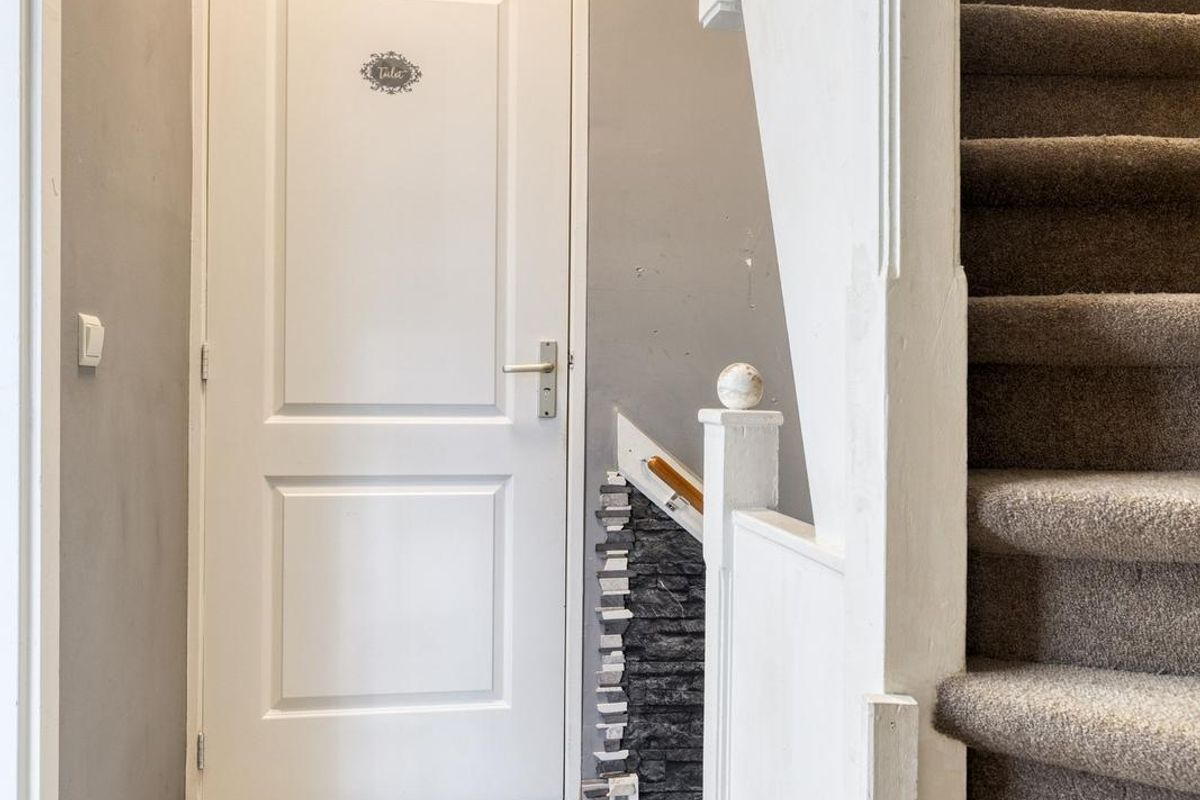 -Overloop: Sfeervolle hal met lichte vloer, nette trap en moderne afwerking. Biedt toegang tot meerdere ruimtes en beschikt over een praktische berging.