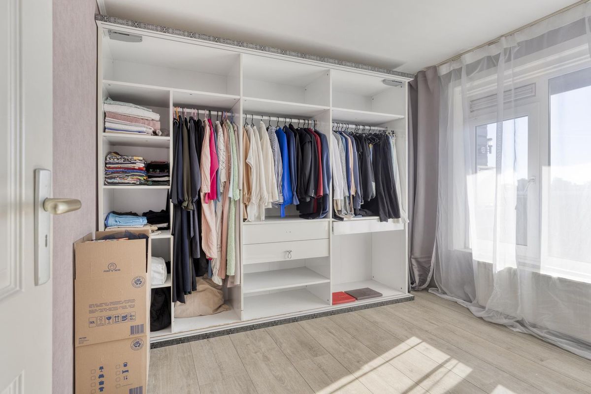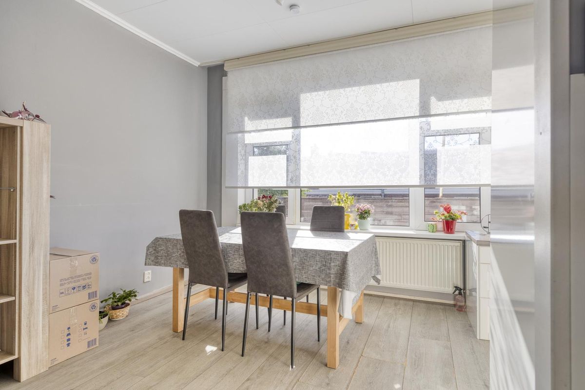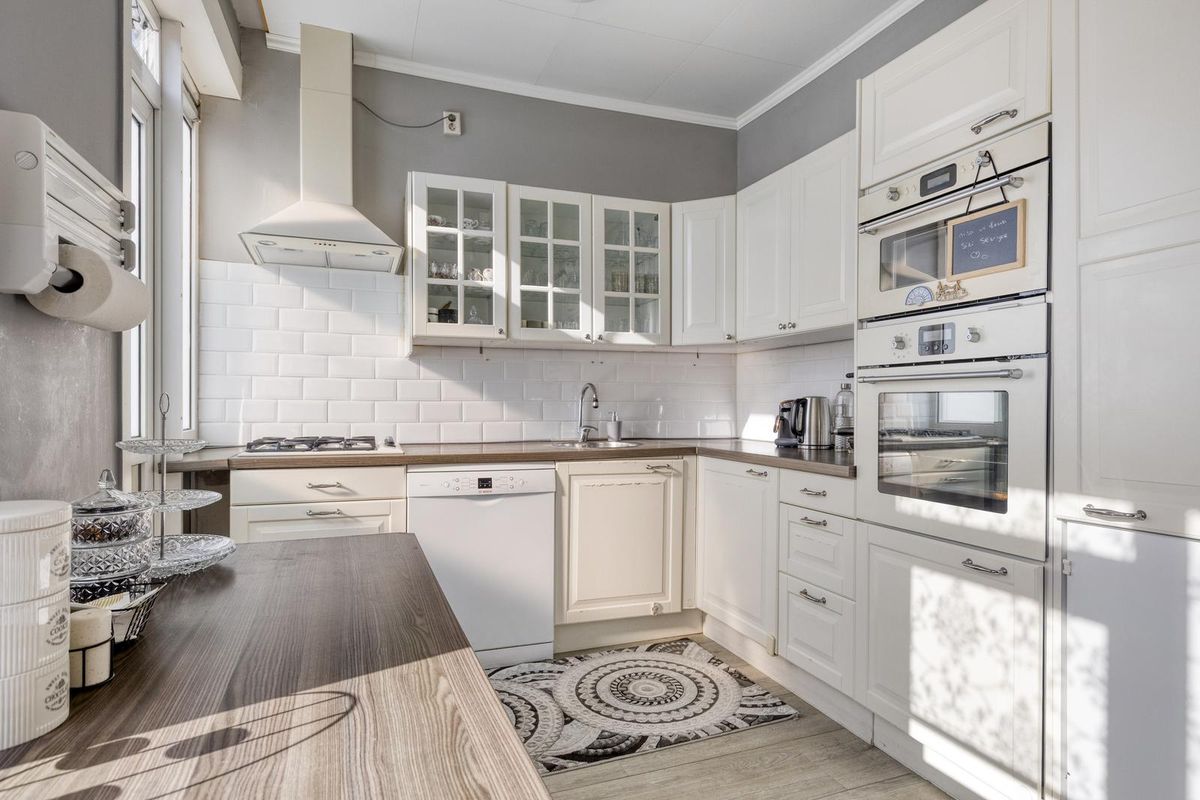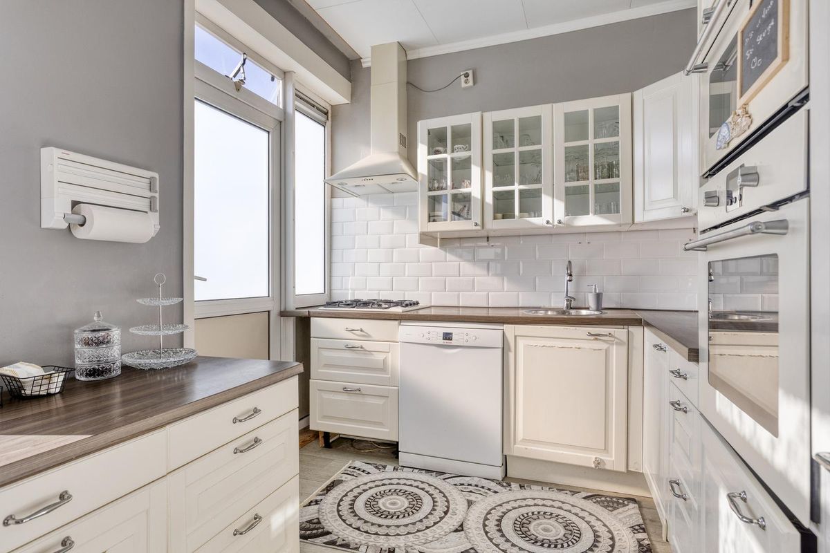-Keuken: De keuken is netjes afgewerkt in een klassieke stijl met witte kastfronten, een houtlook werkblad en een half betegelde achterwand. De indeling is praktisch en biedt voldoende werk- en opbergruimte, met directe toegang tot het balkon.