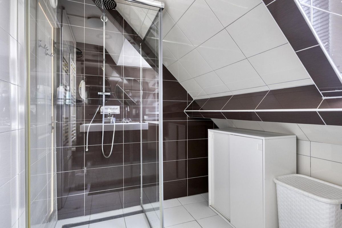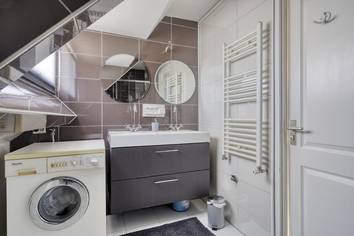 -Badkamer: Deze moderne en mooi afgewerkte badkamer is compleet betegeld en efficiënt ingericht onder een schuin dak, met een inloopdouche, dubbele wastafel met ronde spiegels, wasmachine en opbergkast.